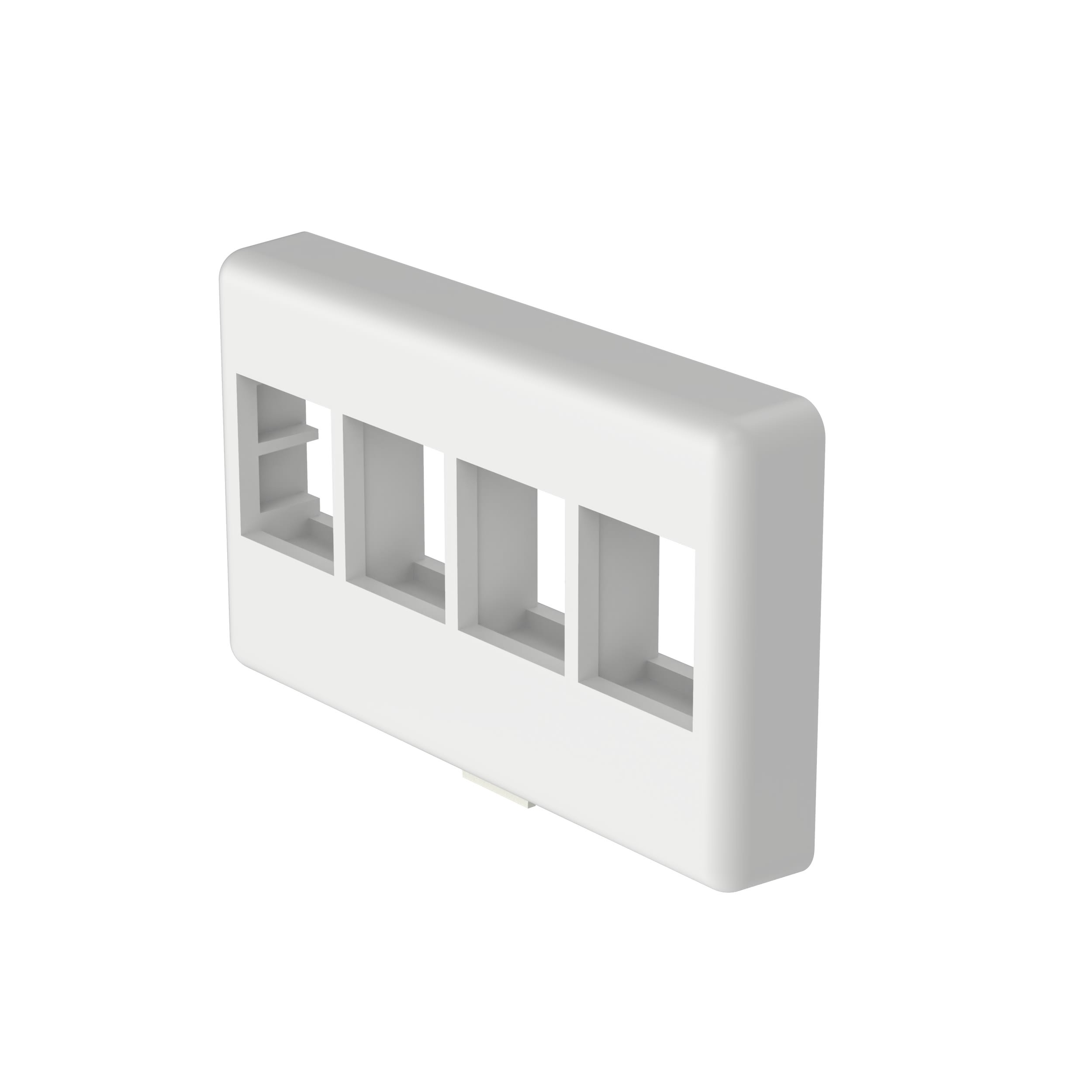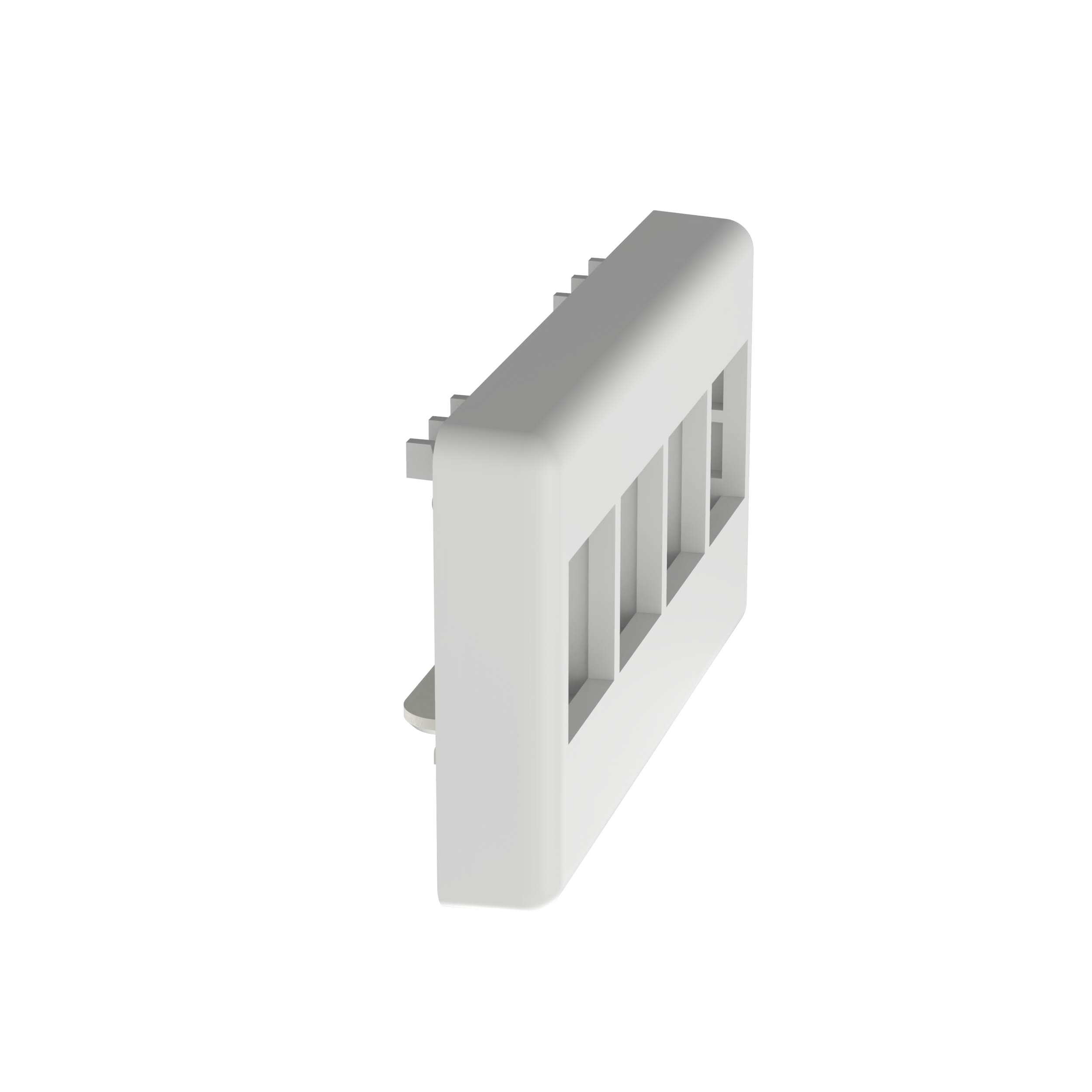 La plaque frontale de mobilier modulaire NetKey™ peut accueillir quatre modules keystone. La plaque frontale se monte sur une ouverture du mobilier de bureau standard. La plaque frontale peut être identifiée à l'aide d'une étiquette adhésive et est de coloris blanc.