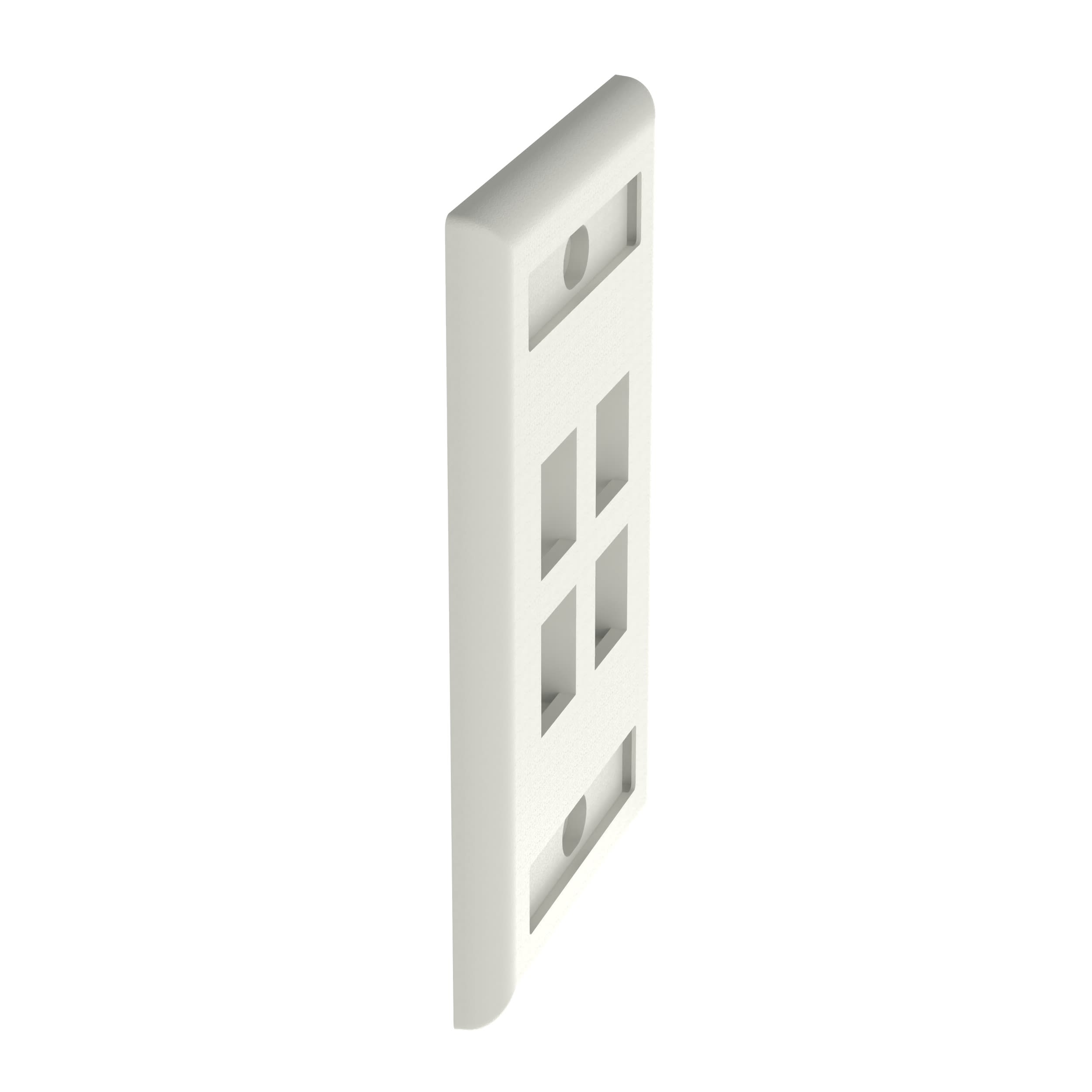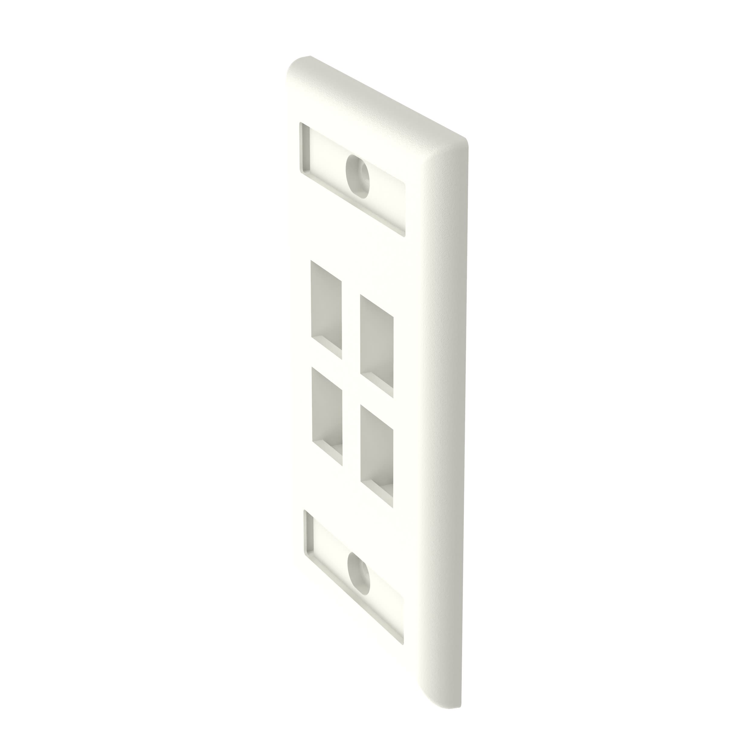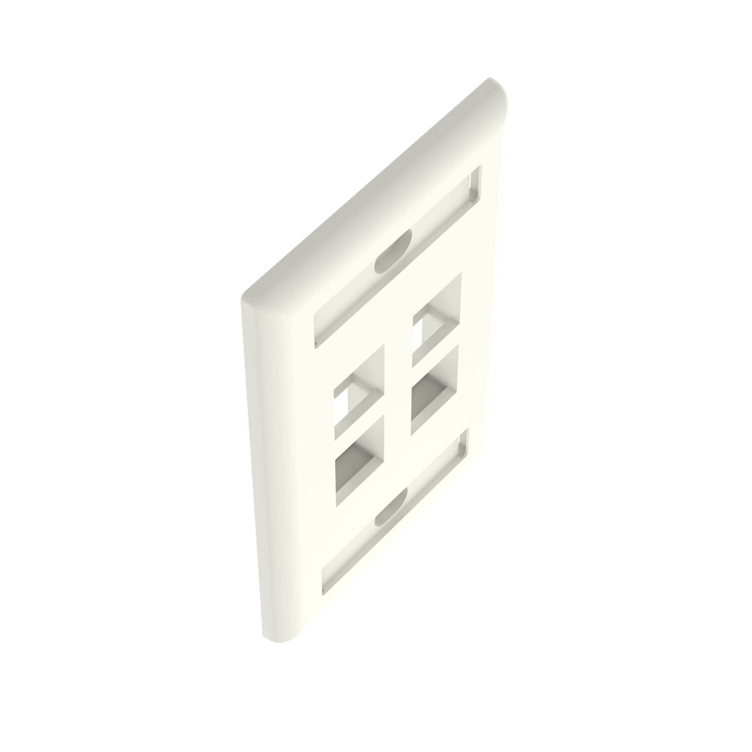 La plaque frontale NetKey™ peut accueillir quatre modules keystone. La plaque frontale est à branchement simple et se monte sur une ouverture à branchement simple standard NEMA. La plaque frontale inclut une poche à étiquettes pour une identification facile et est de coloris blanc cassé.