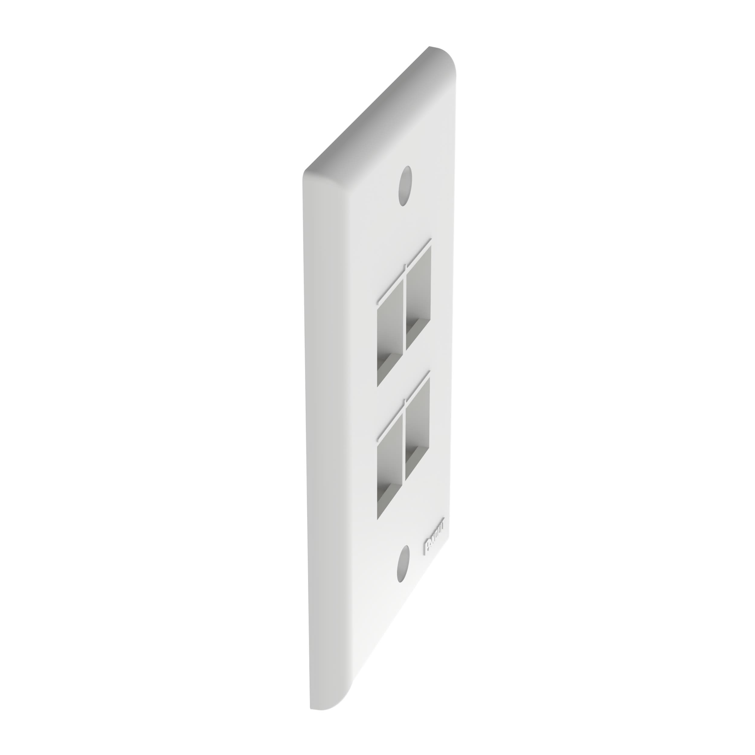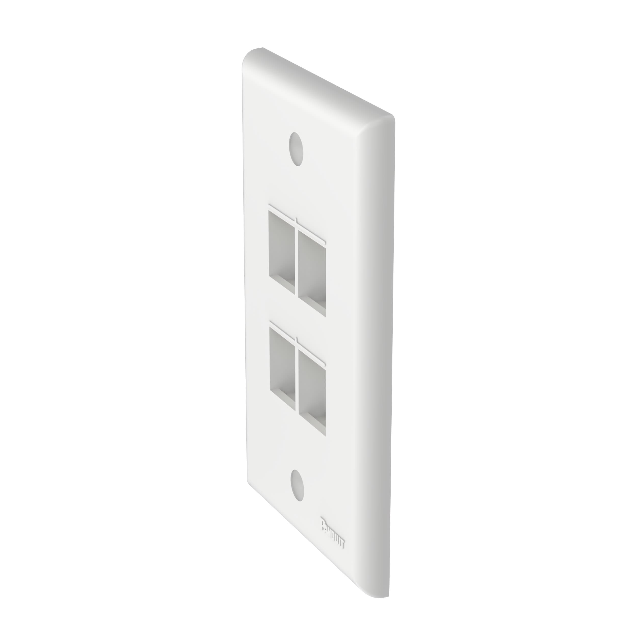 La plaque frontale NetKey™ peut accueillir quatre modules keystone. La plaque frontale est à branchement simple et se monte sur une ouverture à branchement simple standard NEMA. La plaque frontale peut être identifiée à l'aide d'une étiquette adhésive et est de coloris blanc.