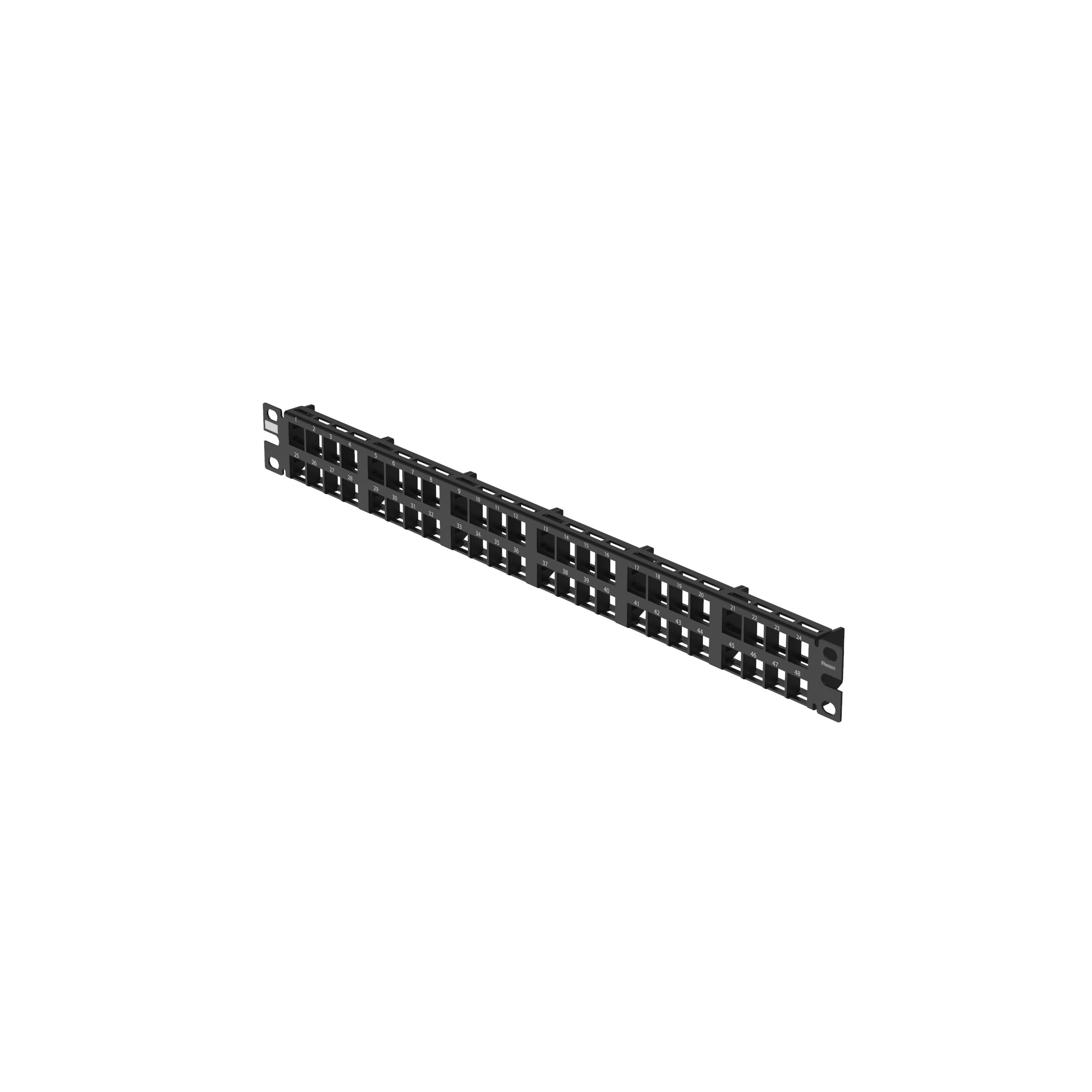 Le panneau de brassage modulaire haute densité NetKey peut accueillir jusqu'à 48 modules keystone pour des applications non blindées dans 1 U et se monte sur des racks et armoires de 48 et 58 cm. Le panneau est noir.