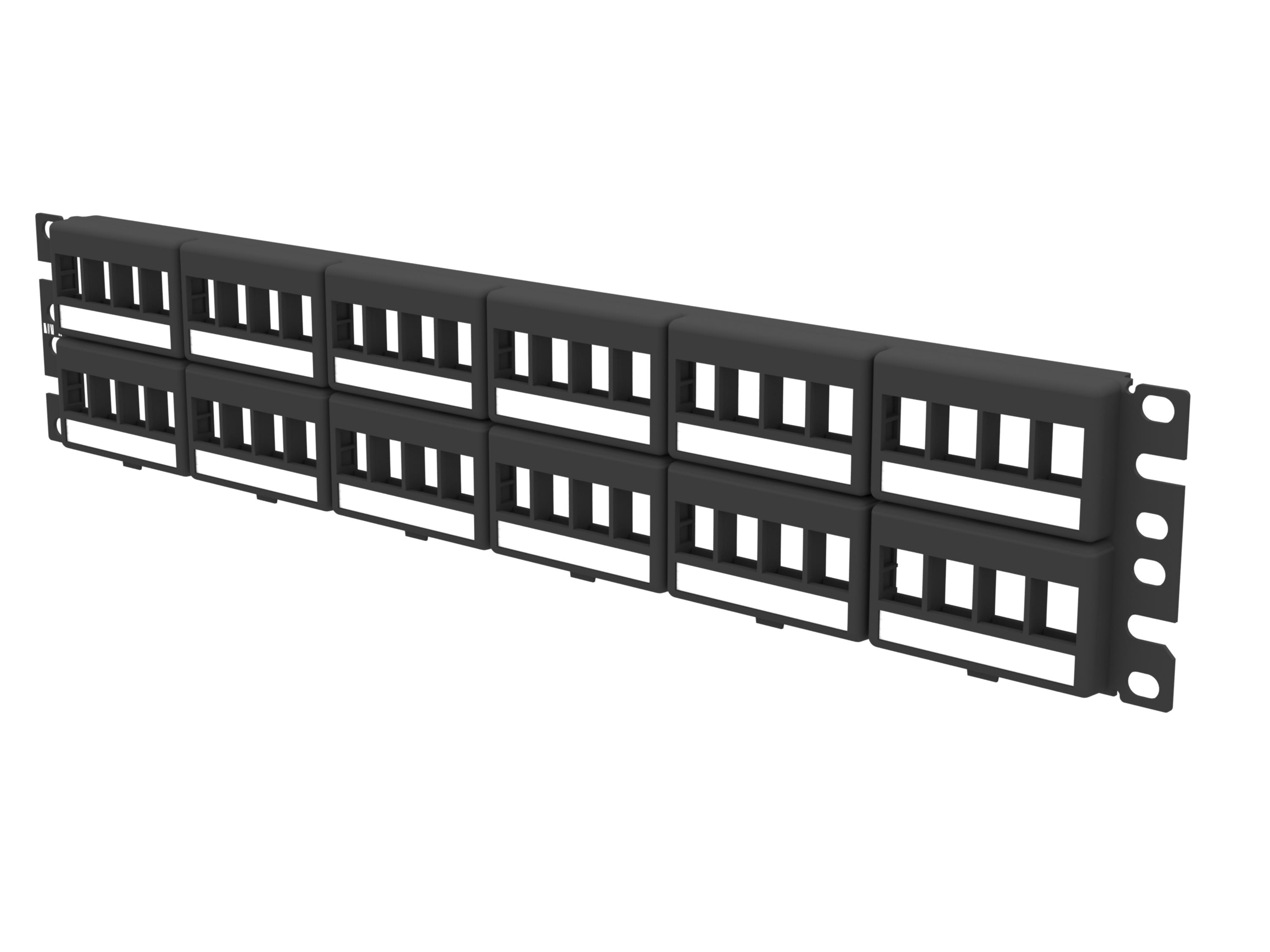Le panneau de brassage modulaire à plaque frontale peut recevoir jusqu'à 48 modules keystone pour applications non blindées en 2 U et des embases pour racks et armoires de 48 et 58 cm. Le panneau offre un accès par l'avant, inclut des étiquettes et protections et est de coloris noir.