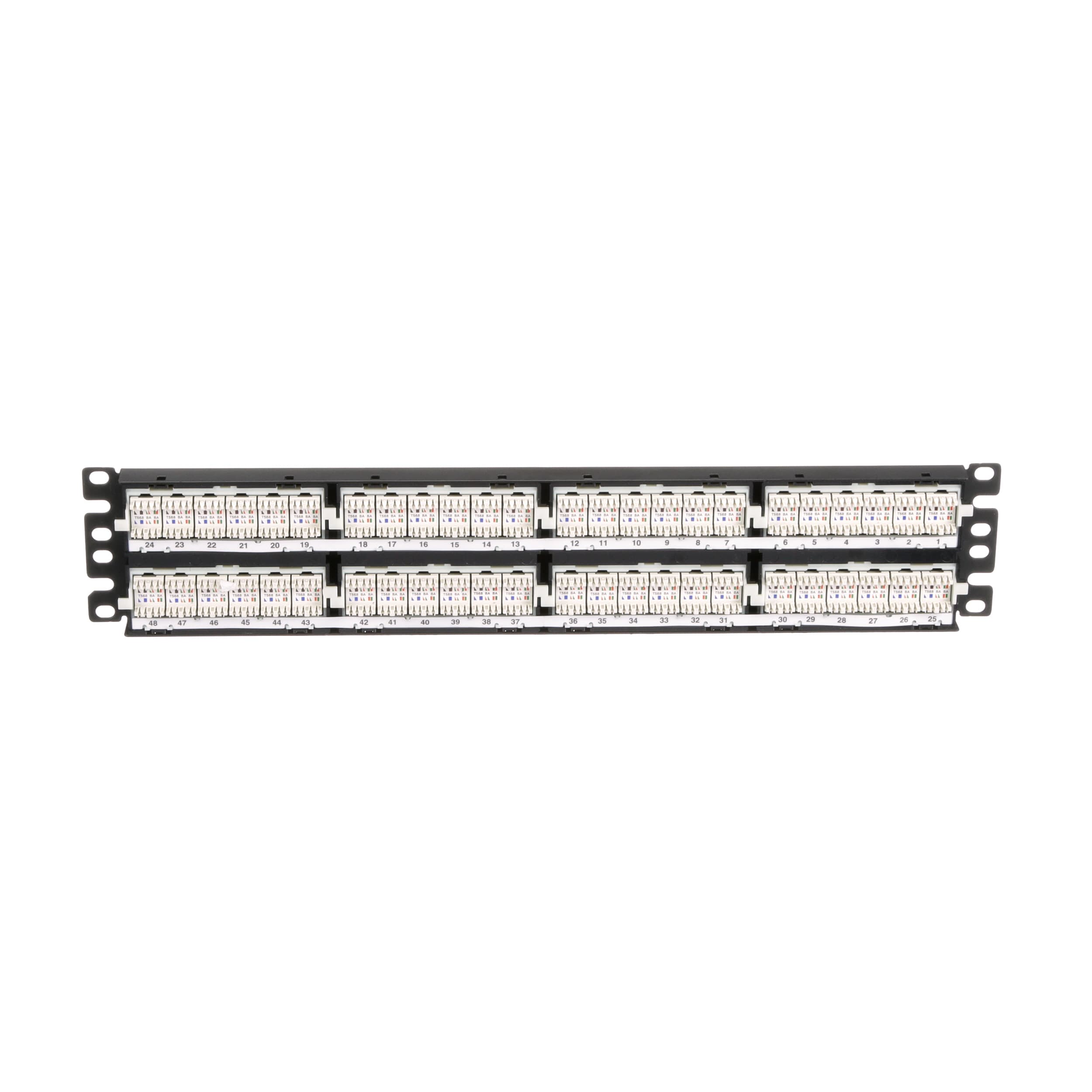 Le panneau de brassage keystone à enfichage plat NetKey™ est conçu pour raccorder les câbles à paires torsadées 100 ohms, 22-26 AWG et 4 paires. Ces panneaux de brassage catégorie 6 se montent sur des racks de 48 cm et 58 cm, et incluent 48 ports. L'interface RJ45 permet une connexion plug and play rapide aux cordons de raccordement RJ45. Ce panneau de brassage à enfichage comporte 2 U, est composé d'acier et disponible en noir.