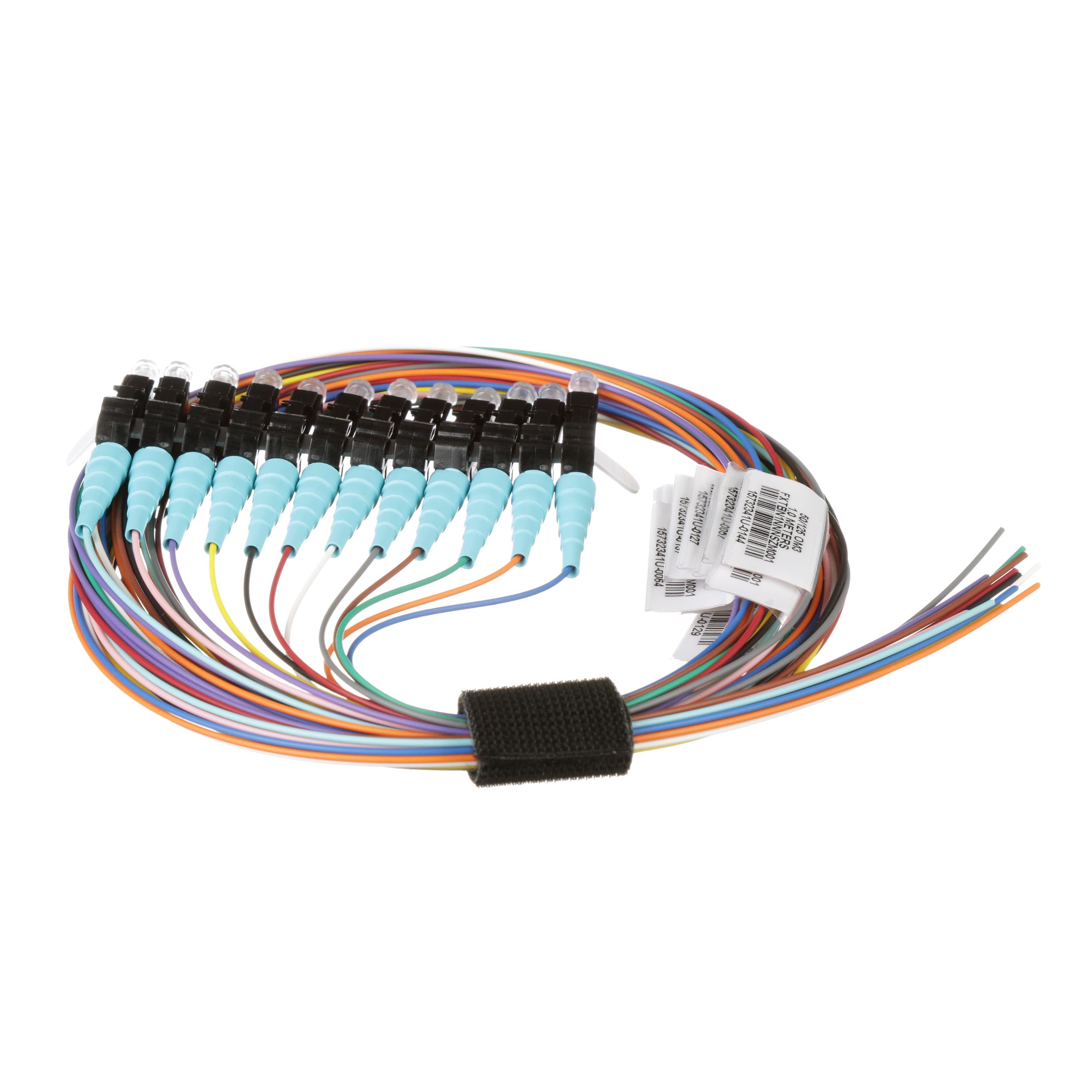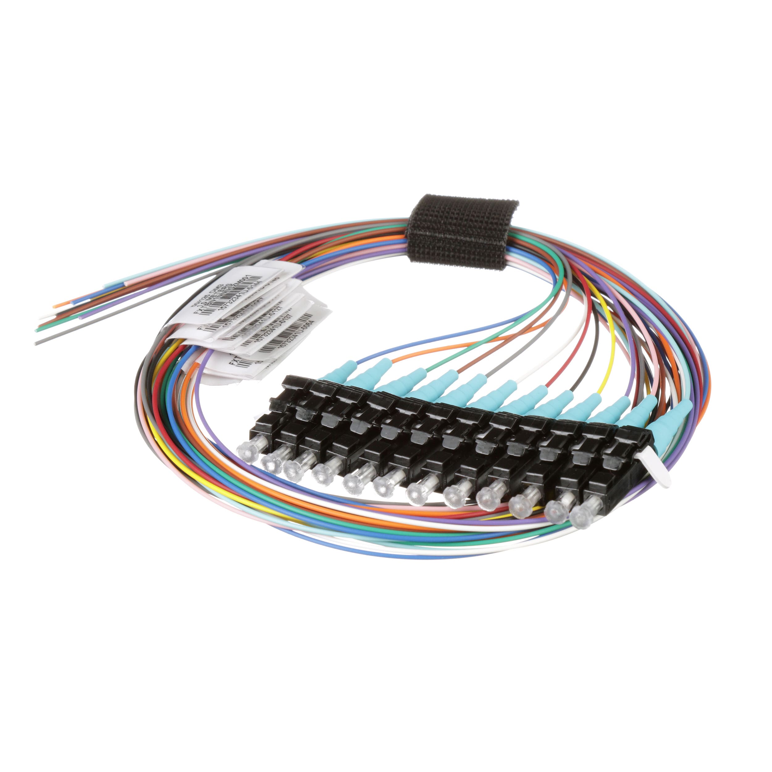 Cordon de brassage 12 fibres OM3 900 µm avec tampon Pigtail, LC Simplex vers Pigtail, polarité standard, perte d'insertion standard, coloris conformes EIA/TIA 598A, 1 m