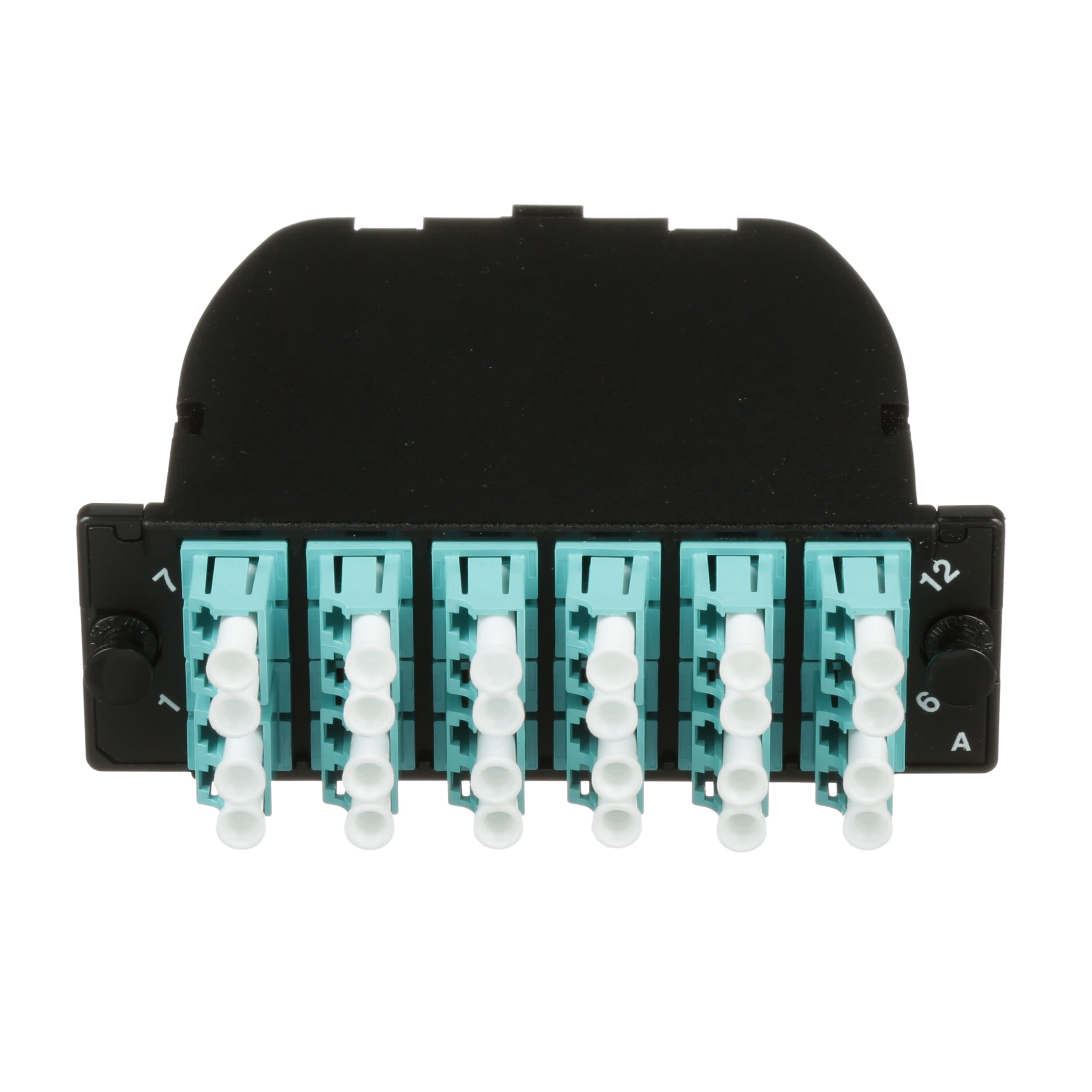 La cassettes pour fibre OptiCom™ est une cassette OM3 2 MPO vers 12 duplex LC et prend en charge 24 fibres au total. Elle dispose d'une perte d'insertion standard et utilise la polarité de méthode standard A. La cassette dispose d'un capot noir avec 2 connecteurs MPO noirs et de 12 adaptateurs LC de coloris Aqua.