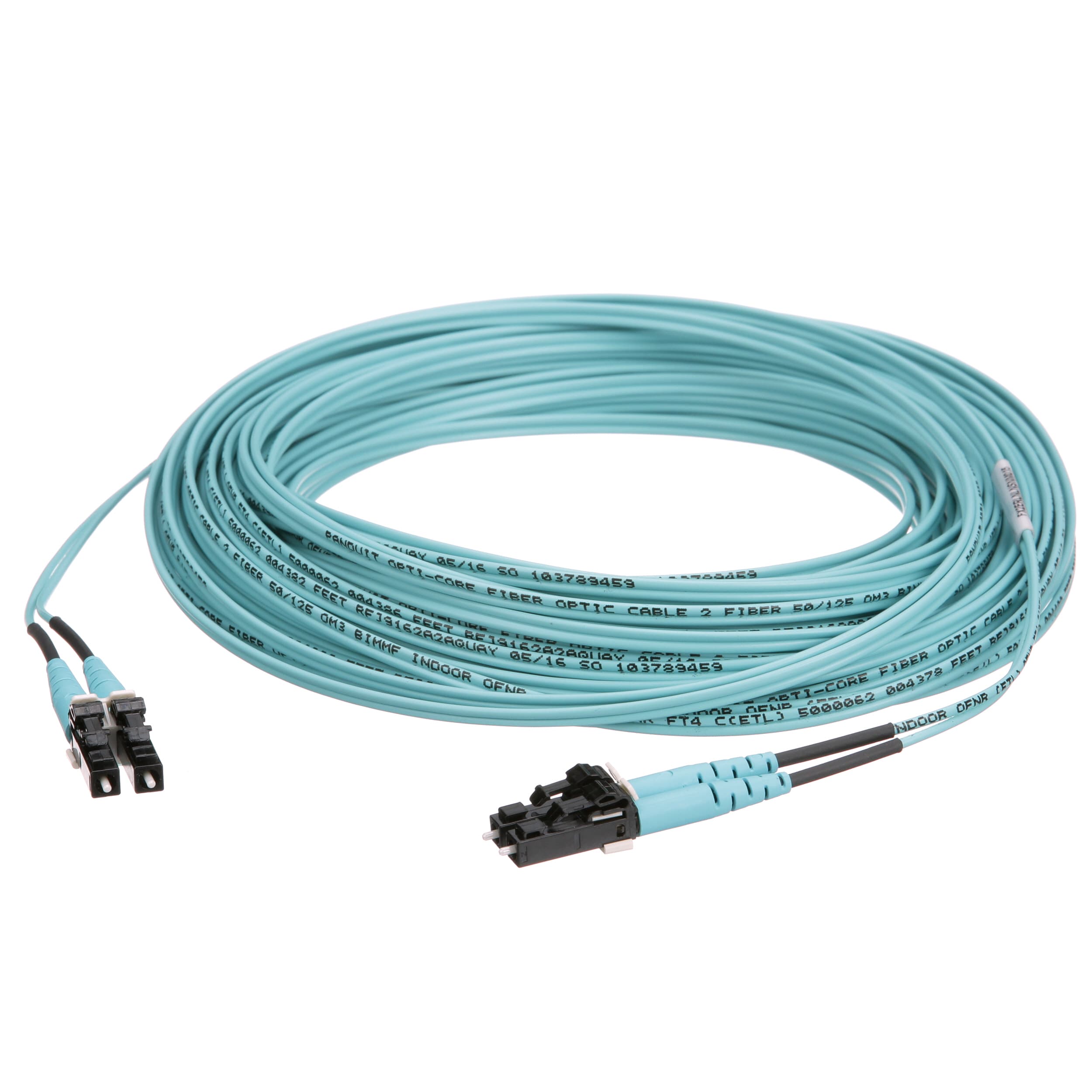 Le cordon de raccordement duplex pour fibre est un cordon OM3 avec gaine de câble de 1,6 mm. Il s'agit d'un câble ascendant (OFNR) homologué qui présente des connecteurs duplex LC, dispose d'une perte d'insertion standard et mesure 15 mètres de long.