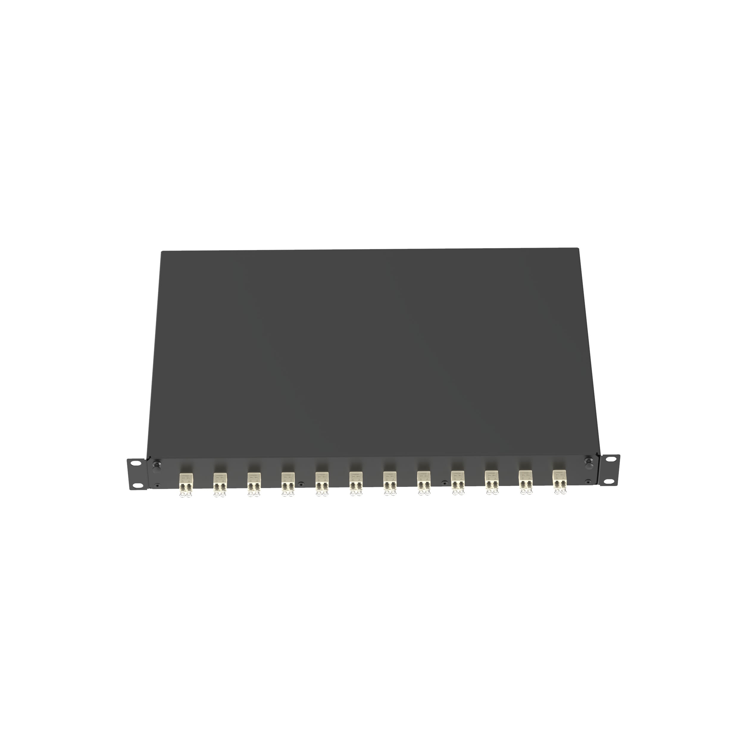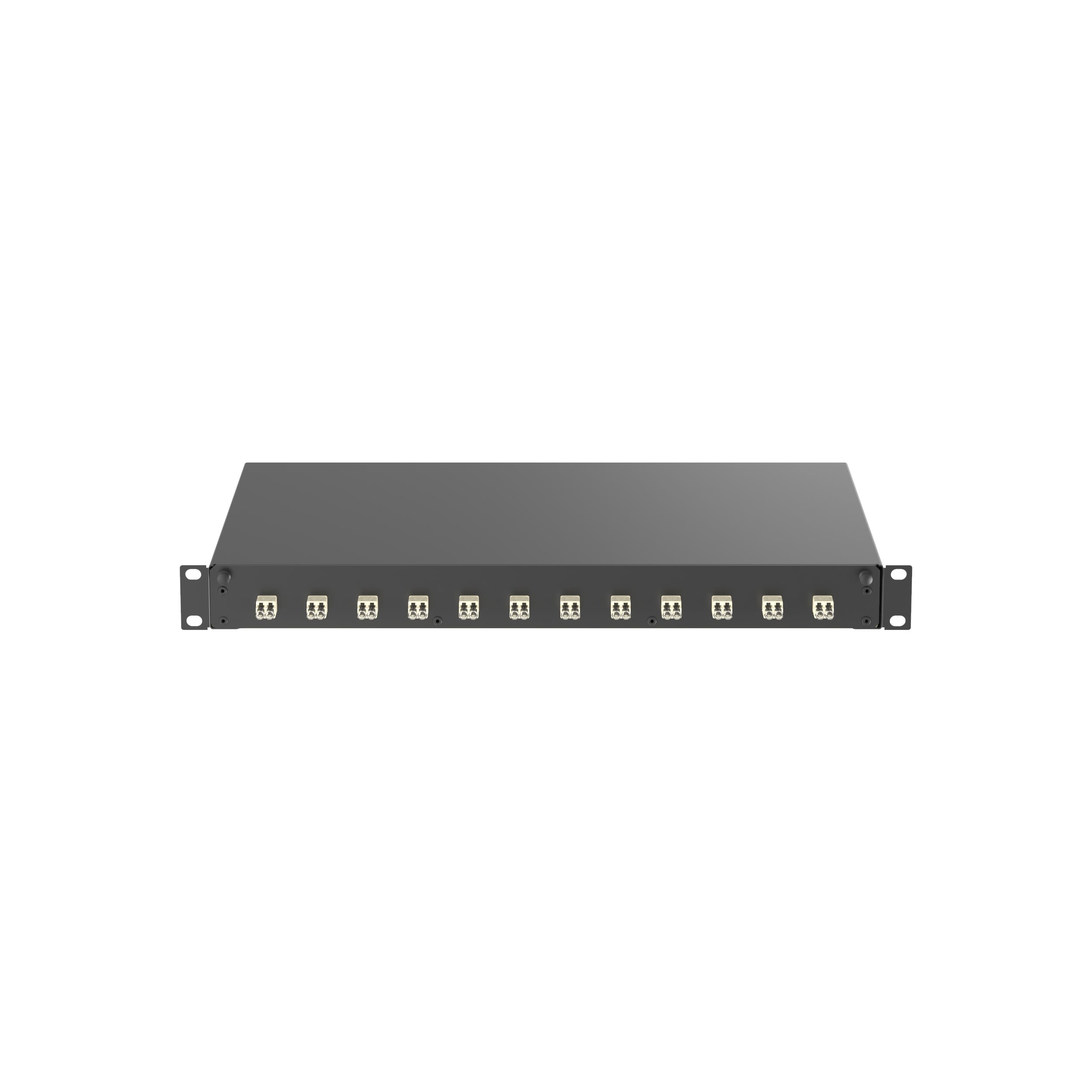 Le tiroir fibre est préchargé avec 24 adaptateurs duplex LC de coloris bleu aqua avec gaines en zirconium. Il est en acier revêtu de poudre noire. Dimensions : H 44 mm × L 445 mm × D 308 mm