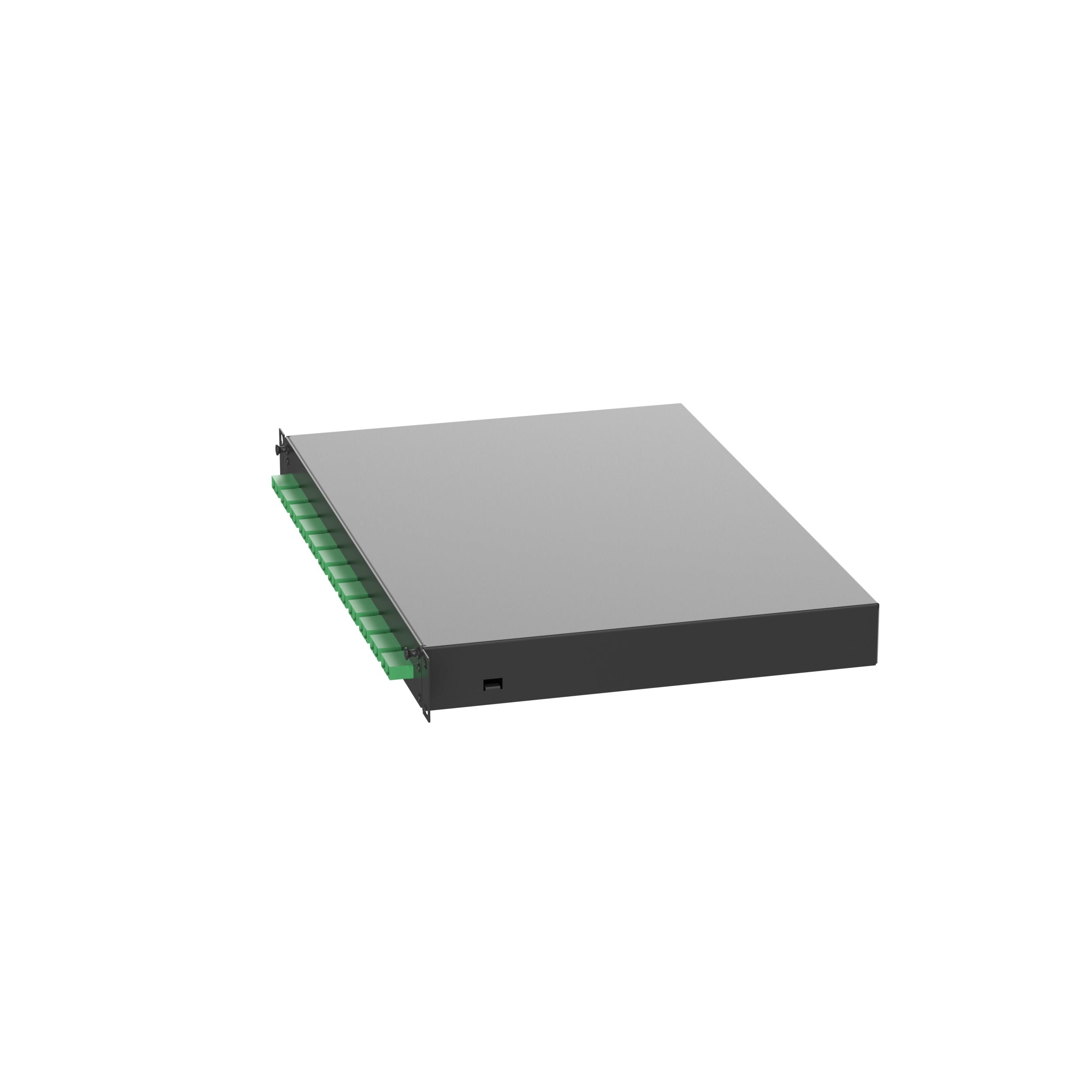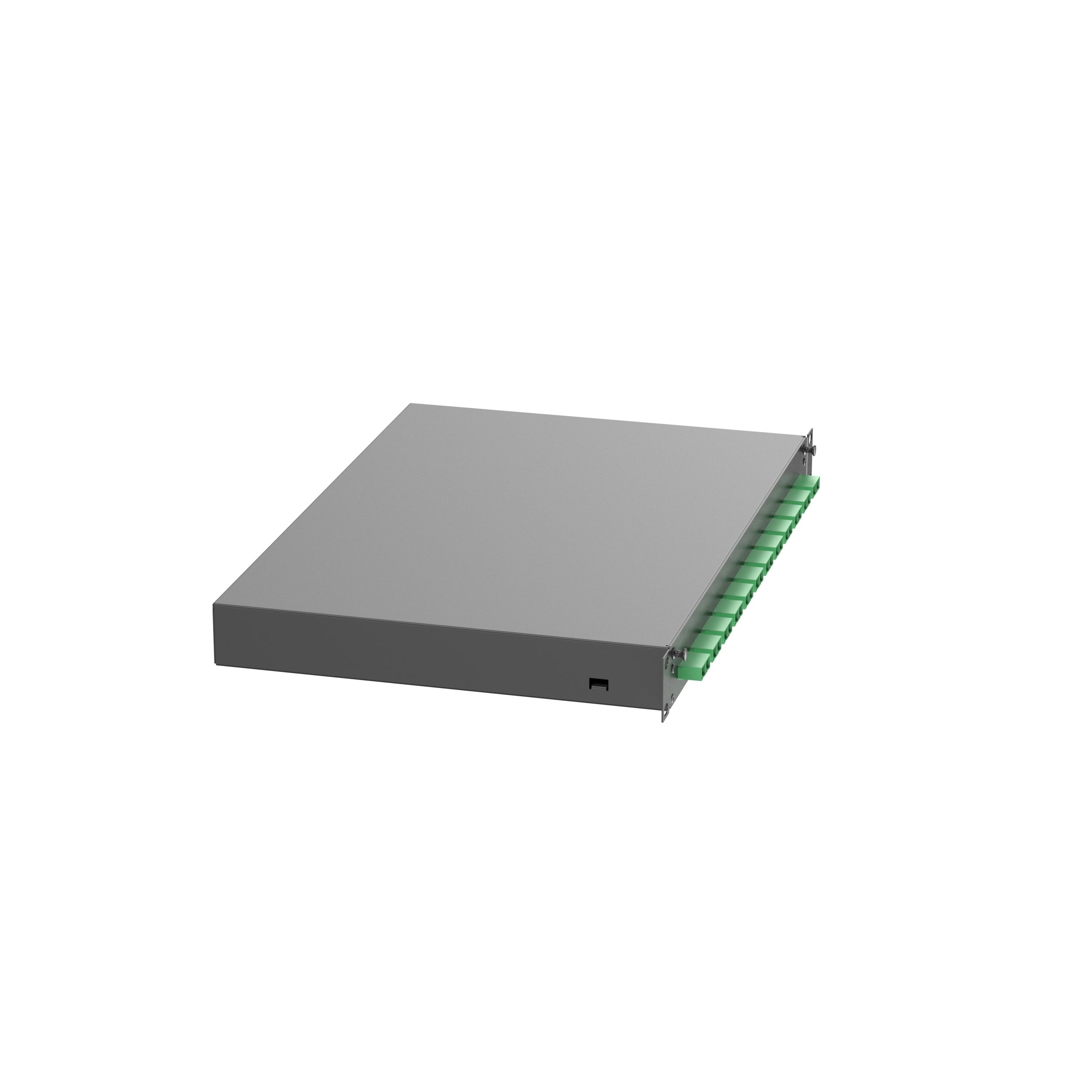 Le tiroir fibre est préchargé avec 12 adaptateurs SC Duplex APC de coloris vert avec gaines en zircone. Fabriqué en acier et revêtu de poudre noire. Dimensions : hauteur 44 mm x largeur 445 mm x profondeur 308 mm