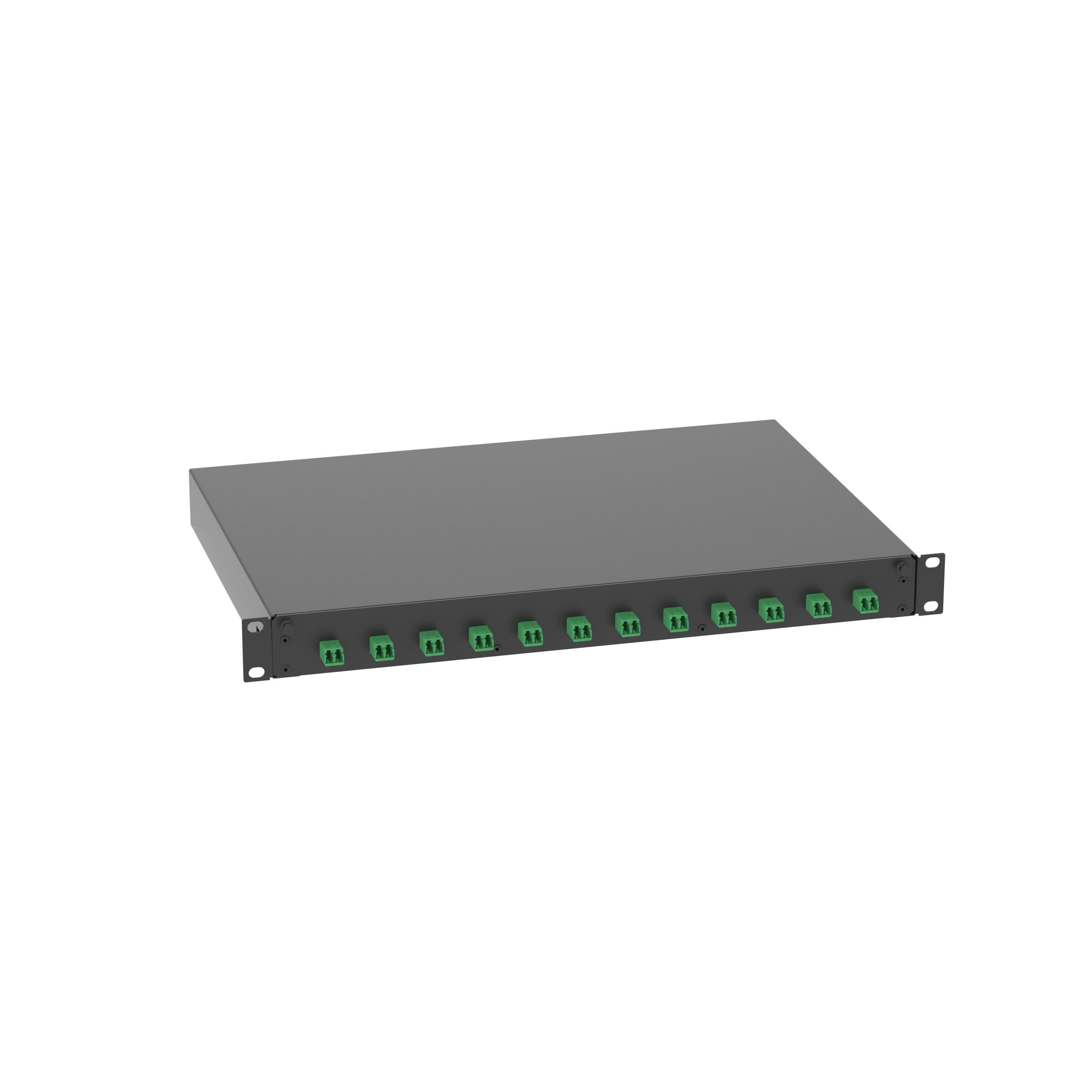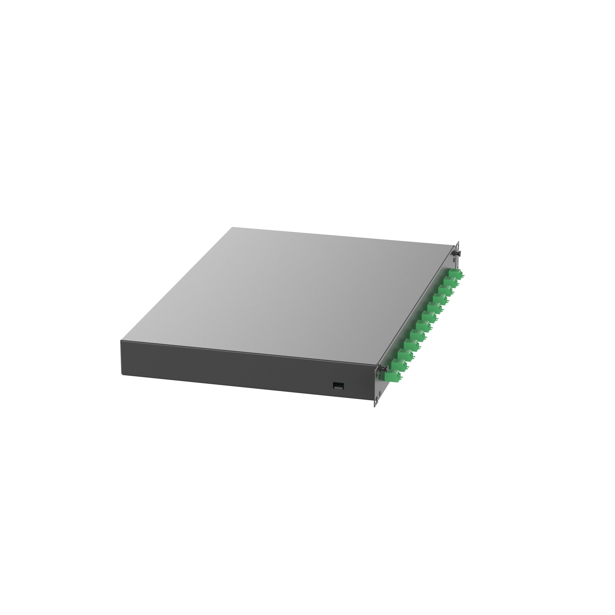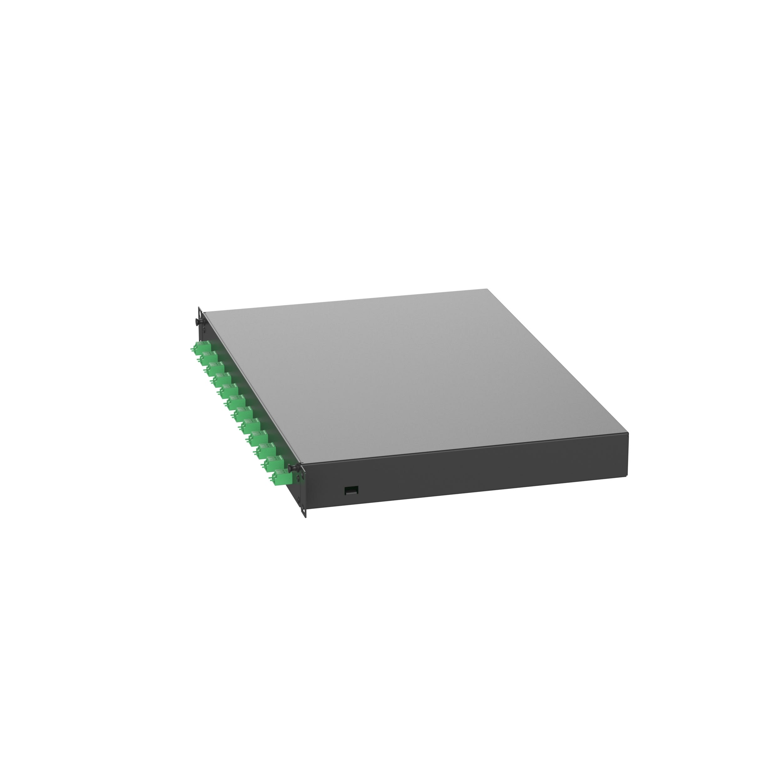 Le tiroir fibre est préchargé avec 12 adaptateurs LC Duplex APC de coloris vert avec gaines en zircone. Fabriqué en acier et revêtu de poudre noire. Dimensions : hauteur 44 mm x largeur 445 mm x profondeur 308 mm