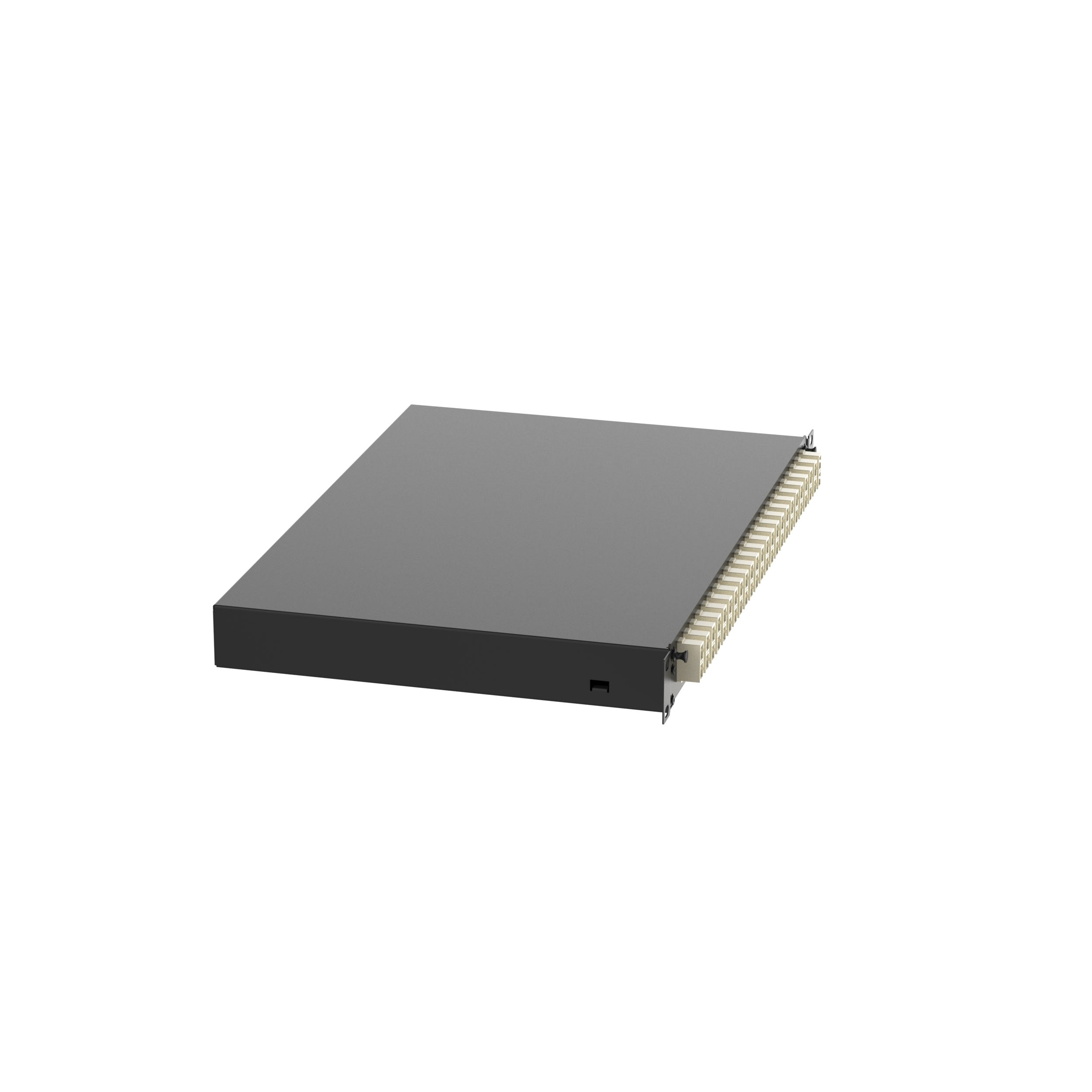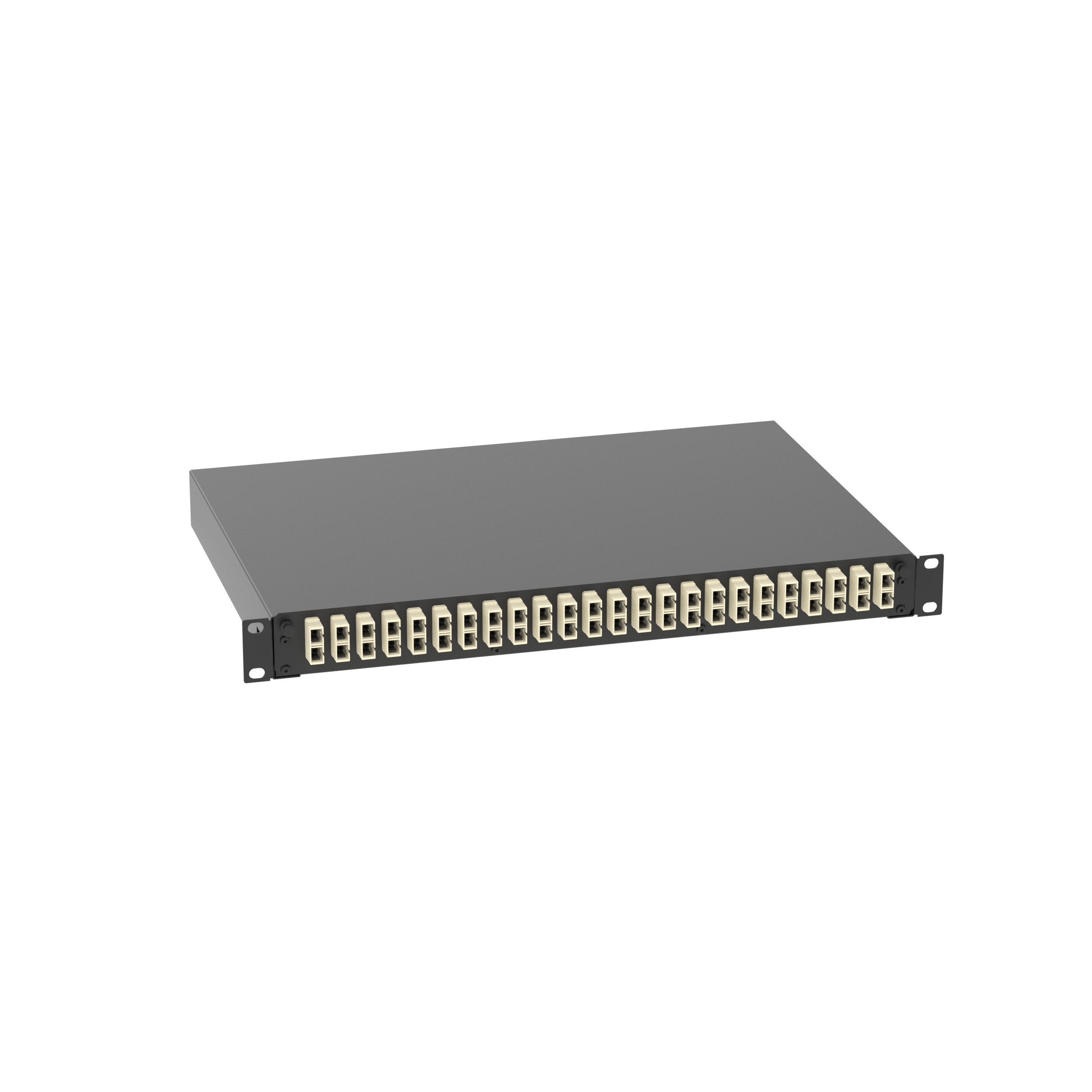Le tiroir fibre est préchargé avec 24 adaptateurs SC Duplex APC de coloris ivoire électrique avec gaines en zircone. Fabriqué en acier et revêtu de poudre noire. Dimensions : hauteur 44 mm x largeur 445 mm x profondeur 308 mm