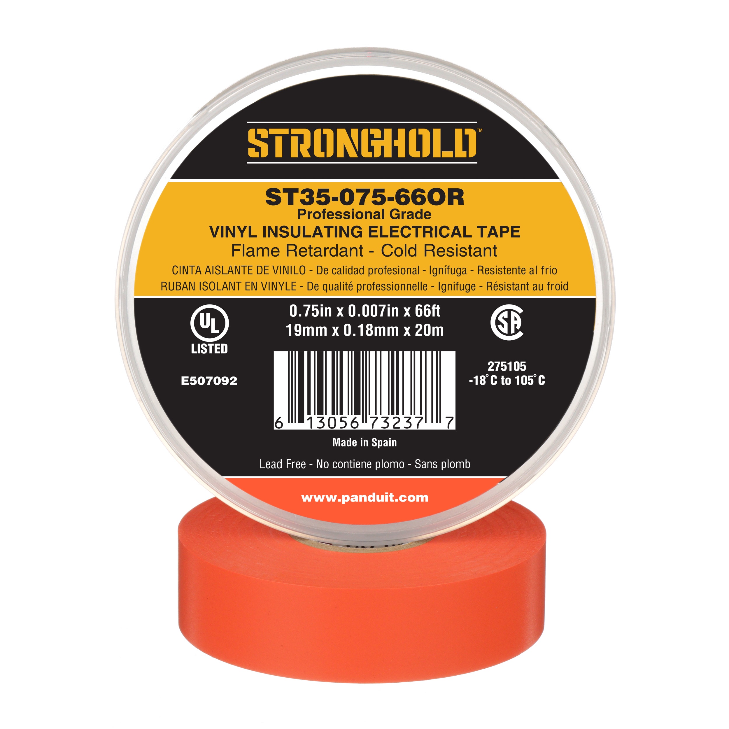 Le ruban électrique en PVC de qualité professionnelle ST35-075-66OR StrongHold est un ruban électrique en vinyle sensible à la pression facile à appliquer et offrant un niveau élevé de performance dans une large plage de températures. Il présente d'excellentes propriétés d'élasticité et d'isolation et mesure 19,05 mm x 20,12 m x 0,178 mm. Il est de coloris orange et vendu dans un emballage individuel en plastique. Convient en tant qu'isolant primaire pour l'épissage jusqu'à 600 volts ou 80 °C et peut être utilisé pour le gainage de protection.
