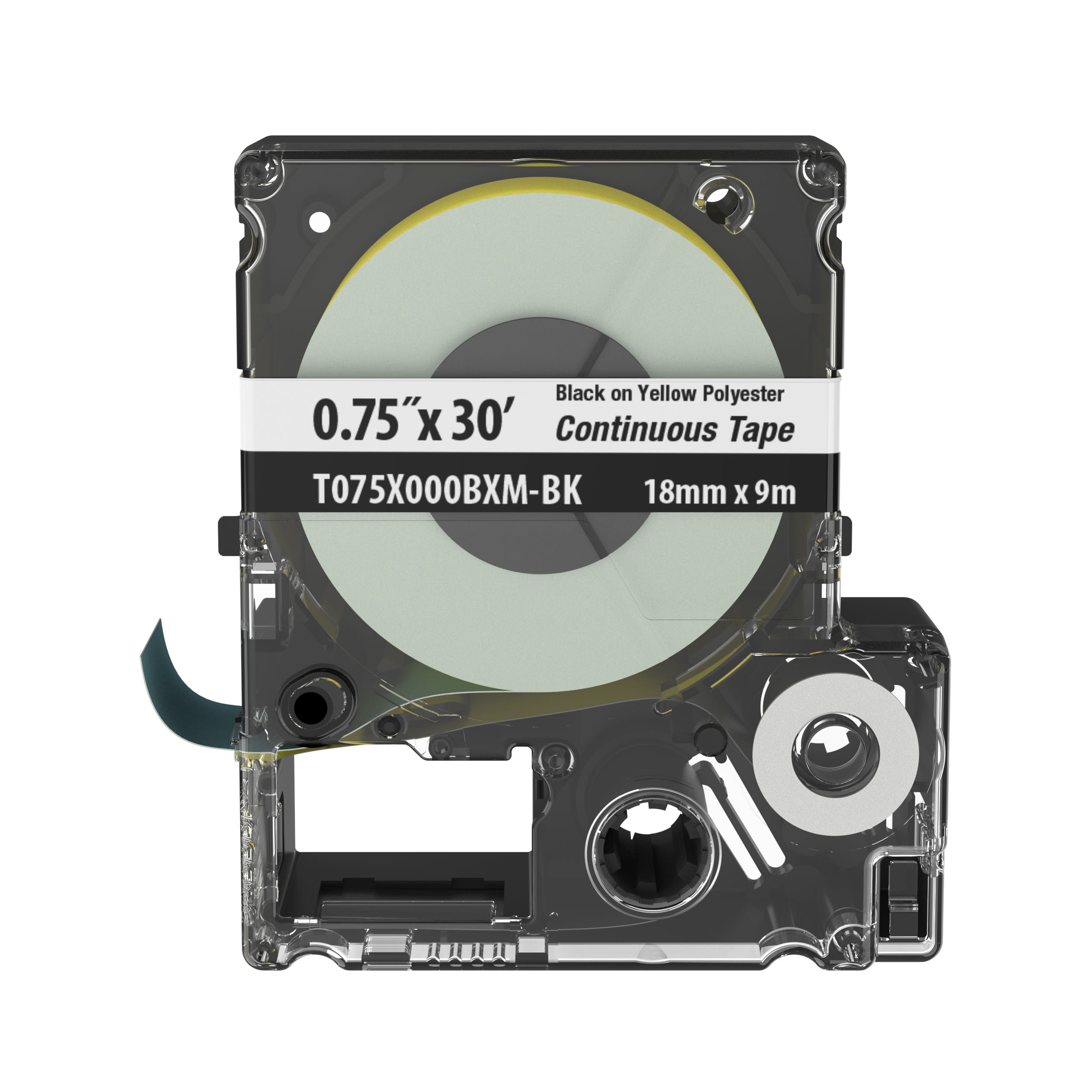 La cassette à ruban continu T075X000BXM-BK comprend à la fois du matériel d'étiquetage et du ruban pour faciliter le changement. Impression personnalisée, à la demande, de marqueurs pour tuyaux ou bacs, indicateurs de tension, panneaux et étiquettes d'identification réseau. Pour des applications d'étiquettes plates uniquement. A utiliser avec les imprimantes MP300, MP200, MP100 et MP75. Polyester. 18 mm × 9,1 m. Coloris noir sur jaune. 1 cassette par package.