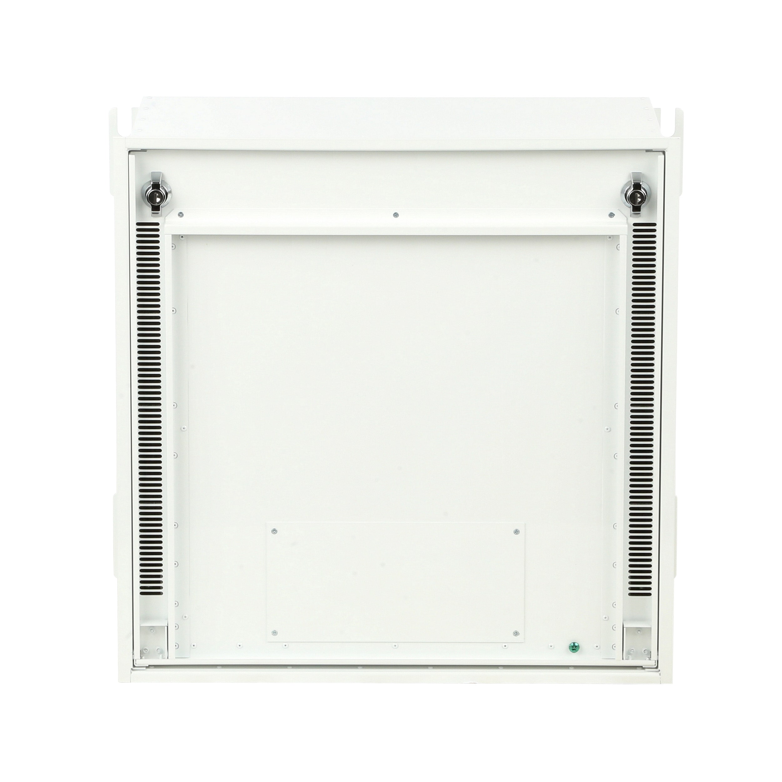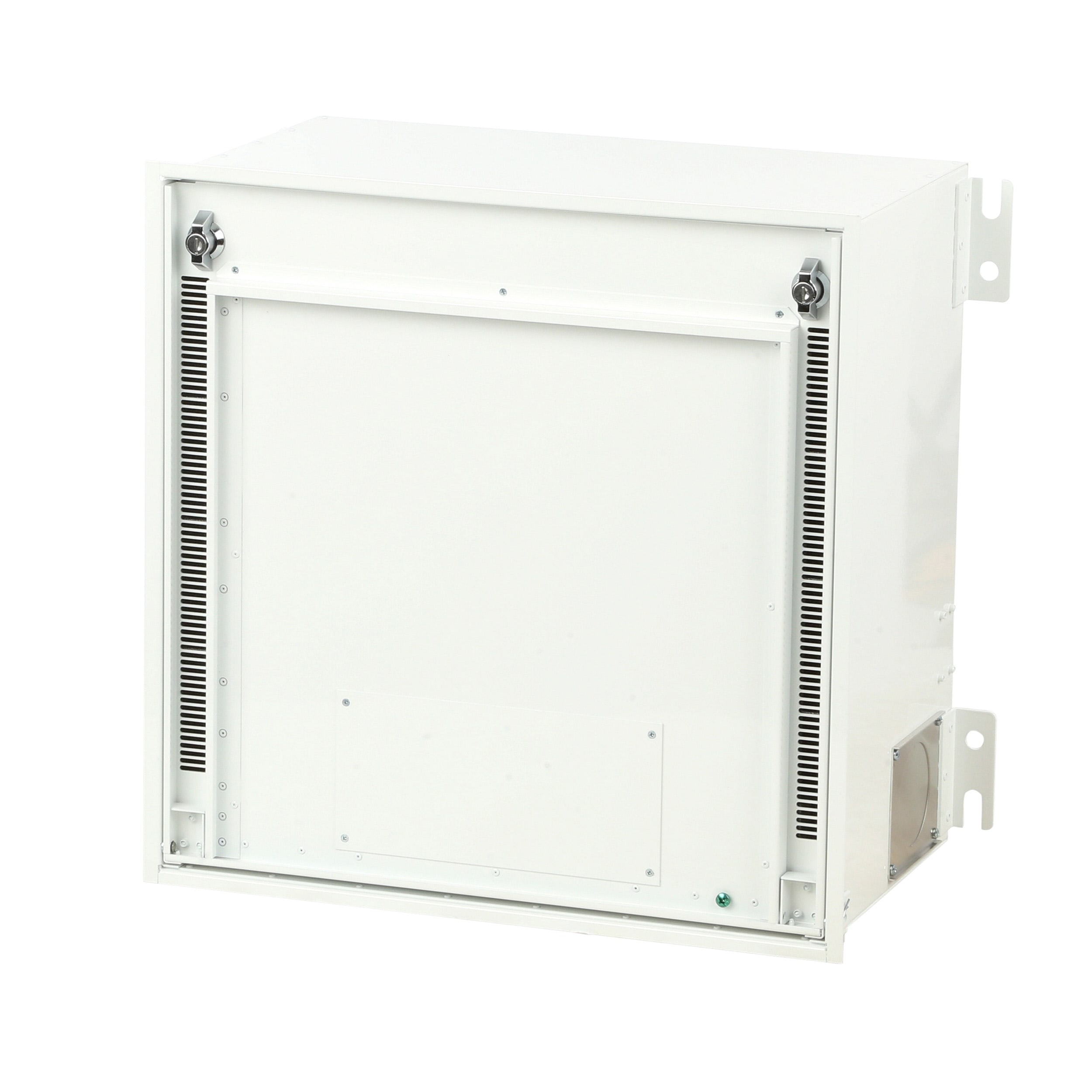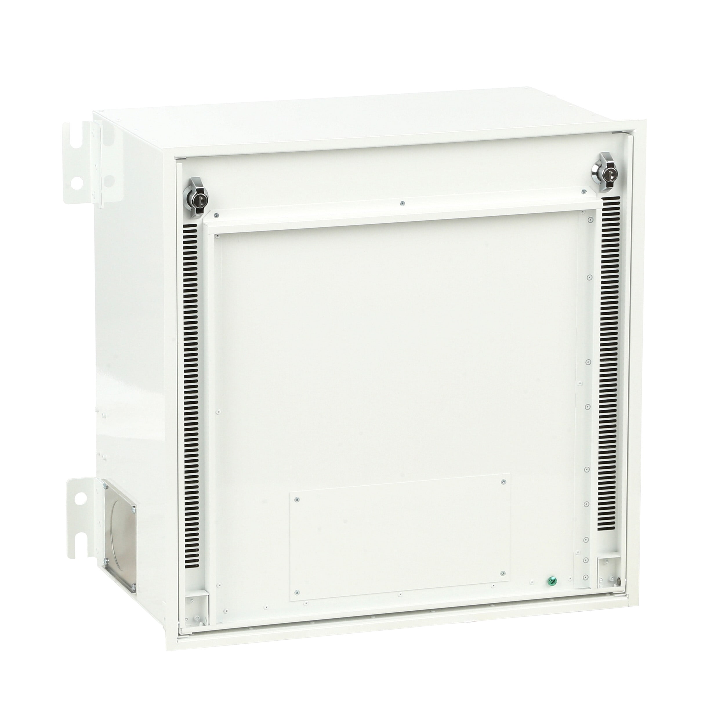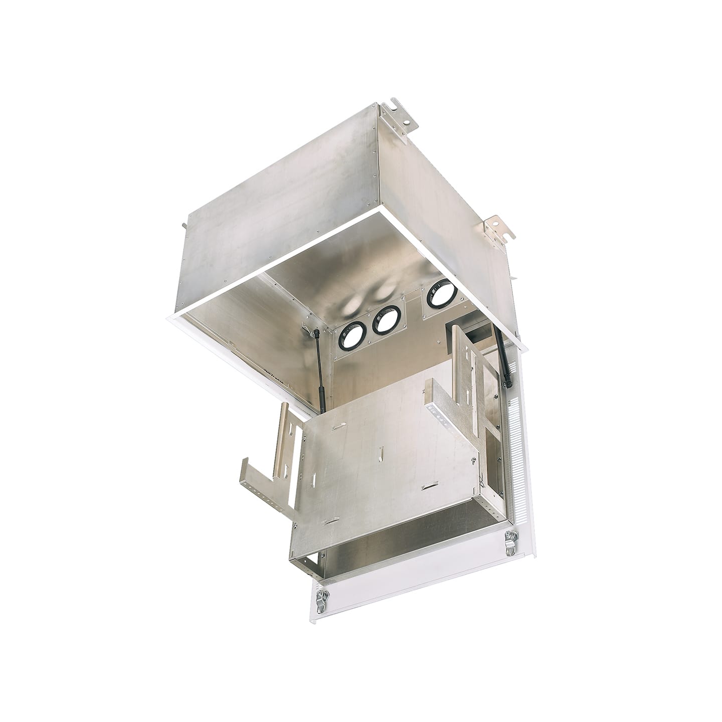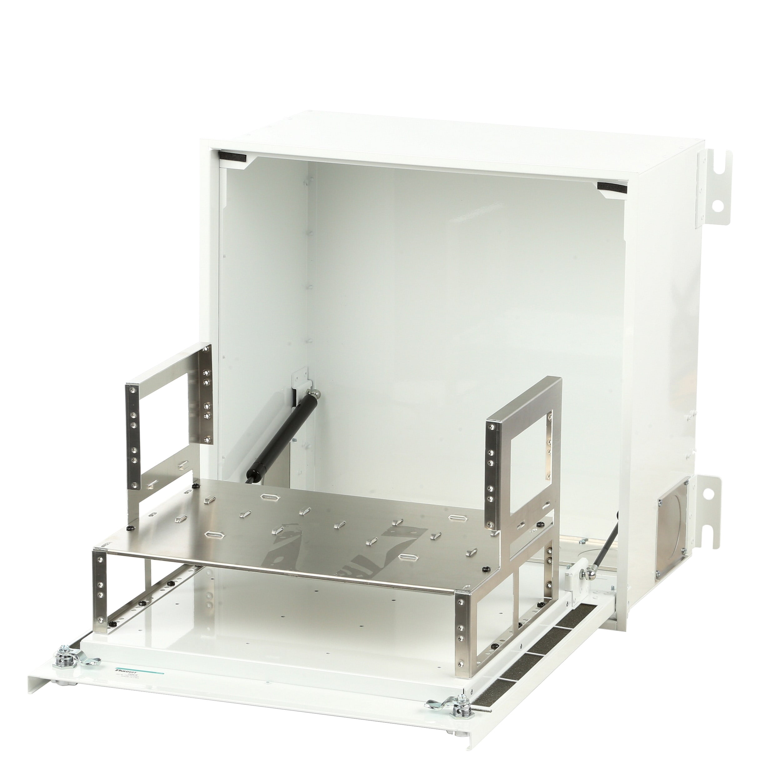 Le boîtier PanZone premium passif encastré dans le plafond, doté de cylindres d'air d'assistance au gaz pour la porte à charnière, peut accueillir jusqu'à 8 U de panneaux de brassage 19 po standard, comprend des supports de montage et un gestionnaire de bobine horizontal intégré.