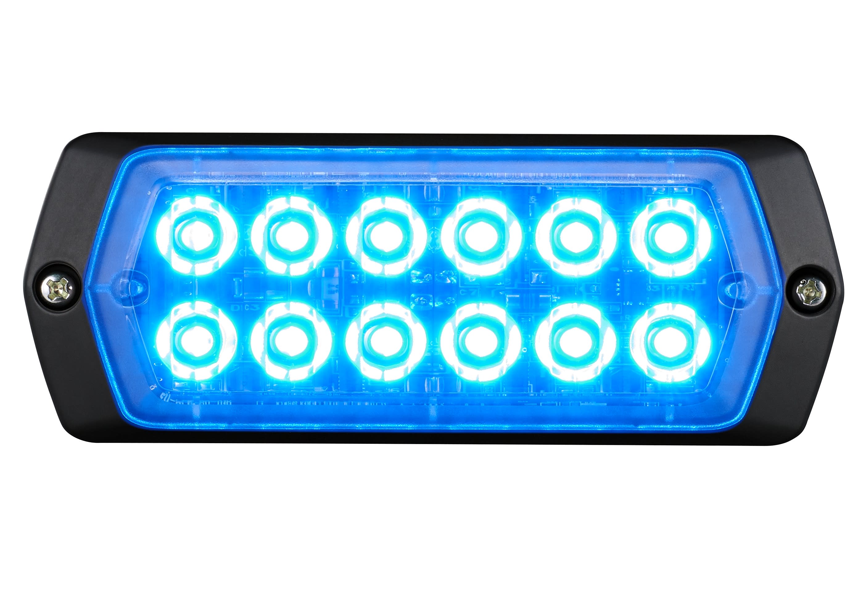Voyant d’avertissement extrême bleu avec divers motifs de flash. Durable 100 000 heures sans entretien. Possibilité de chainer plusieurs unités et régler le fonctionnement en simultané ou alternatif. L 114,4mm, P 13,5mm, H 43,4mm. 2x6LED.