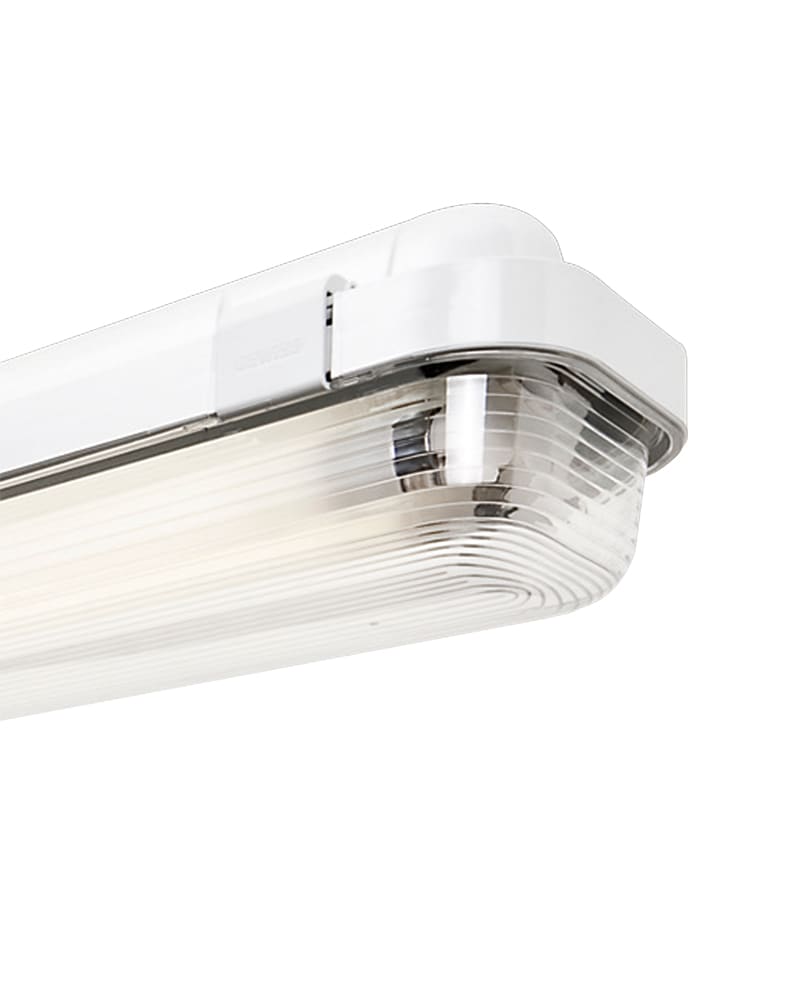 Luminaire étanche à l'eau à usage professionnel en polycarbonate avec blindage transparent. Les versions à deux lampes peuvent être montées dans un corps à lampe unique, assurant des performances et une compacité optimales. Adapté pour usage industriel ou commercial..