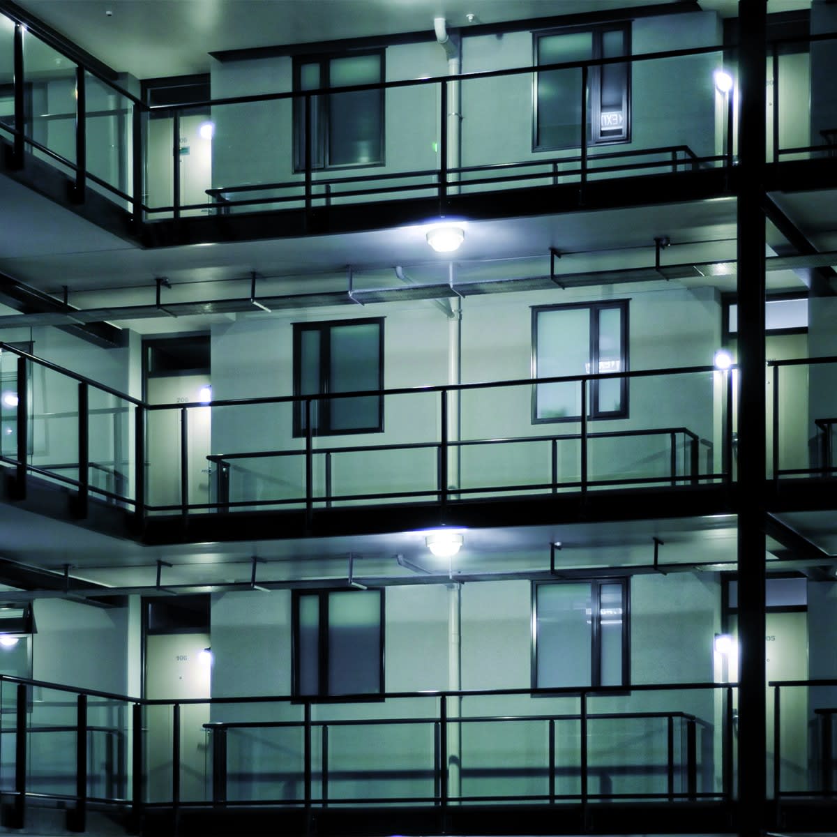 Appareil pour installation en applique et au plafond, aussi bien à l'intérieur qu'à l'extérieur, composé de : Boîtier, cercle et écrans en aluminium moulé sous pression peint / Diffuseur en verre pressé satiné intérieurement / Réflecteur en aluminium pour les versions incandescence / Joint en EPDM / Cercle et écrans solidaires avec le diffuseur / Ne permet pas le câblage traversant / Vis de fermeture en acier inox