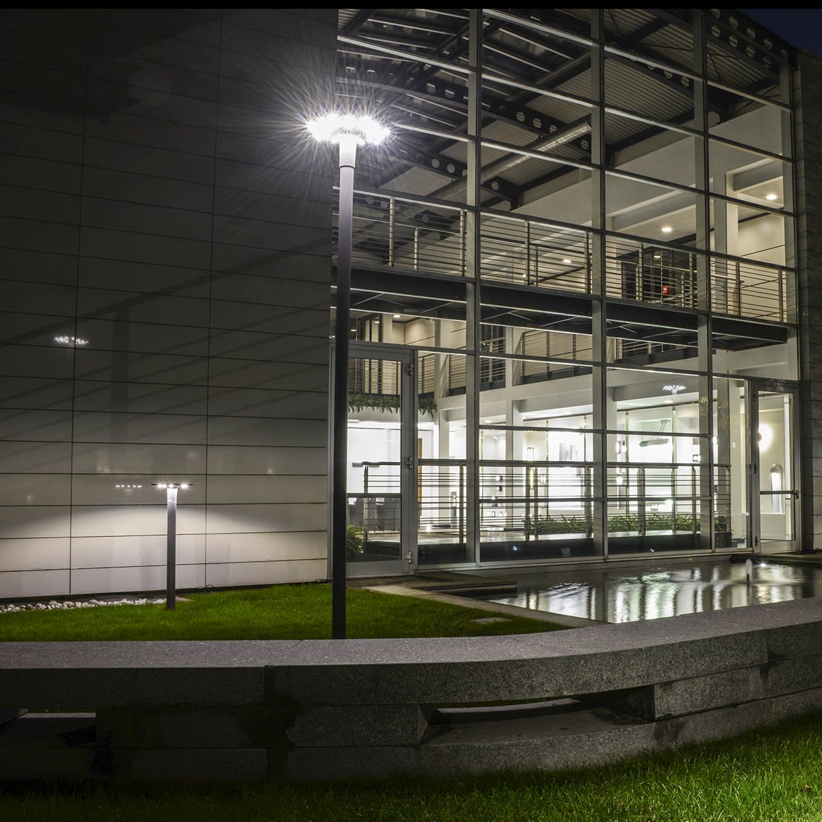 Appareil de jardin sur poteau pour un éclairage général, composé de: Corps en aluminium moulé sous pression peint par poudre polyester / Diffuseurs en verre satiné intérieur / Joints en silicone antivieillissement / Branchement électrique simplifié grâce à un connecteur externe prise-fiche étanche QUICK, équipé d'un câble / Vis de fermeture en acier inox / Poteau en aluminium extrudé peint h 900 mm pour les versions PADO 900 / Peinture en poudre polyester très haute résistance aux rayons UV et aux agents atmosphériques en 13 étapes
