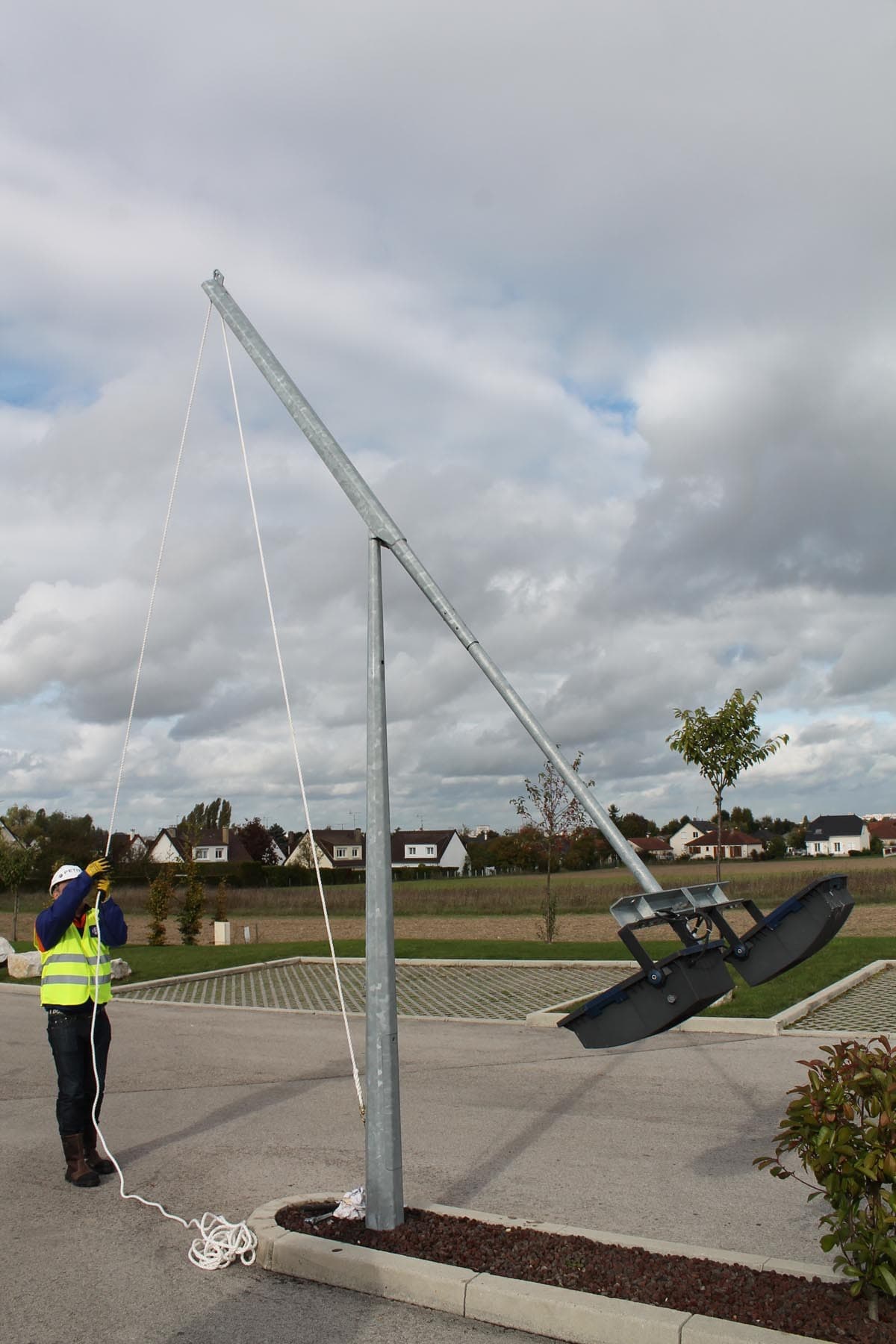 BM RC est un mât basculant à section rond conique en acier, protégé par un procédé de galvanisation à chaud. Ce mât d'une hauteur de 5,5m et d'un diamètre de 60mm en top et 150mm en base est une fabrication française. Ce produit est vendu avec des tiges de scellement aux dimensions suivantes : J16/14x300. L'entraxe de la semelle est de 200mmx200mm. La bascule du mât se fait à l'aide d'une corde mouflée, ce type de mât est particulièrement intéressant pour les endroits difficiles d'accés par des engins comme des quais par exemple.