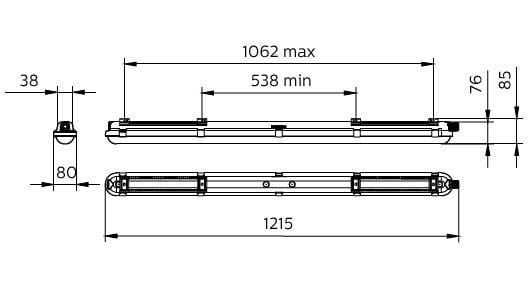 L1200 mm, Polycarbonate, Gris, Bloc d’alimentation électrique (Marche/Arrêt), 2700 lm, 20.5 W, 131 lm/W, 131 lm/W, 4000 K, (0.38,0.38)SDCM=3, Faisceau extensif, Mat, Polycarbonate, IP65 | Protection contre la pénétration de poussière, protection contre les jets d’eau, IK08 | 5 J protection contre le vandalisme, Classe électrique I, Connecteur à poussoir 3 pôles, Connexion simple et cache amovible disponible pour le câblage de traversée monophasé (le câblage interne n'est pas inclus)