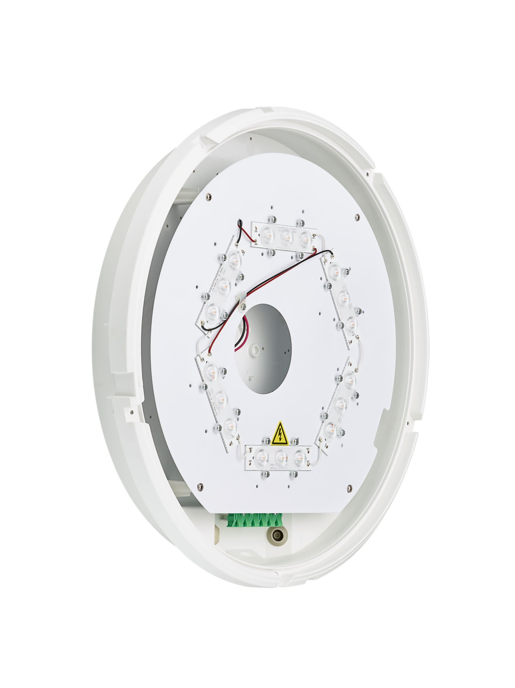 D390 mm, Polycarbonate, Blanc, Blanc de sécurité (RAL9003), Système Interact Ready de pilotes sans fil, 3350 lm, 35.5 W, 94 lm/W, 3000 K, (0.4338,0.4030) SDCM 3, Symétrique, Opale, Polycarbonate, IP65 | Protection contre la pénétration de poussière, protection contre les jets d’eau, IK10 | 20 J résistance au vandalisme, Classe de sécurité II, Connecteur à poussoir 6 pôles