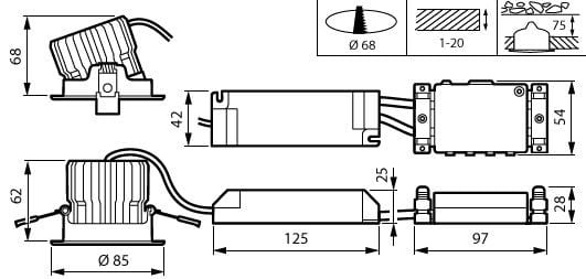 CoreLine Recessed Spot gen2, Adjustable, D68 mm, Fonte d’aluminium, Blanc, Bloc d'alimentation avec interface DALI externe, 1380 lm, 12.3 W, 112 lm/W, 4000 K, (0.38, 0.38) SDCM 5, Faisceau extensif, Polycarbonate, IP20/44 | Protection des doigts, protection des fils, protection contre les éclaboussures, IK03 | 0,3 J, Classe de sécurité II, Câble 0,25 m avec connecteur 5 pôles, Connecteur à poussoir 5 pôles