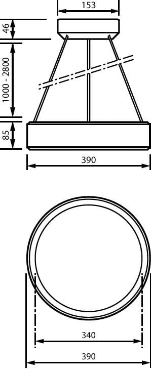 D390 mm; H85 mm, Polycarbonate, Blanc, Suspension, Système Interact Ready de gradation Dali, 1817 lm, 15.4 W, 118 lm/W, 3000 K, (0.44, 0.40) SDCM 3, CRI90, UGR19, Angle d’ouverture de faisceau 90°, Optique micro-hexagonale, Polystyrène, IP20 | Protection des doigts, IK04 | 0,5 J standard plus, Classe de sécurité II, 2 connecteurs à poussoir 5 pôles, Câblage traversant 1 phase, TP(b) diffuser flammability class