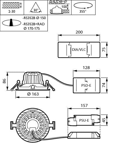 C/O D150 mm, Aluminium, Noir, Poudrage simple couche, Bloc d'alimentation externe (Marche/Arrêt), 2900 lm, 22.5 W, 129 lm/W, 2700 K, (0.458, 0.410) SDCM 2, Faisceau ultra-extensif, Réflecteur PerfectAccent, IP20 | Protection des doigts, IK02 | 0,2 J standard, Classe de sécurité II, 2 connecteurs à poussoir 2 pôles, TP(a) diffuser flammability class