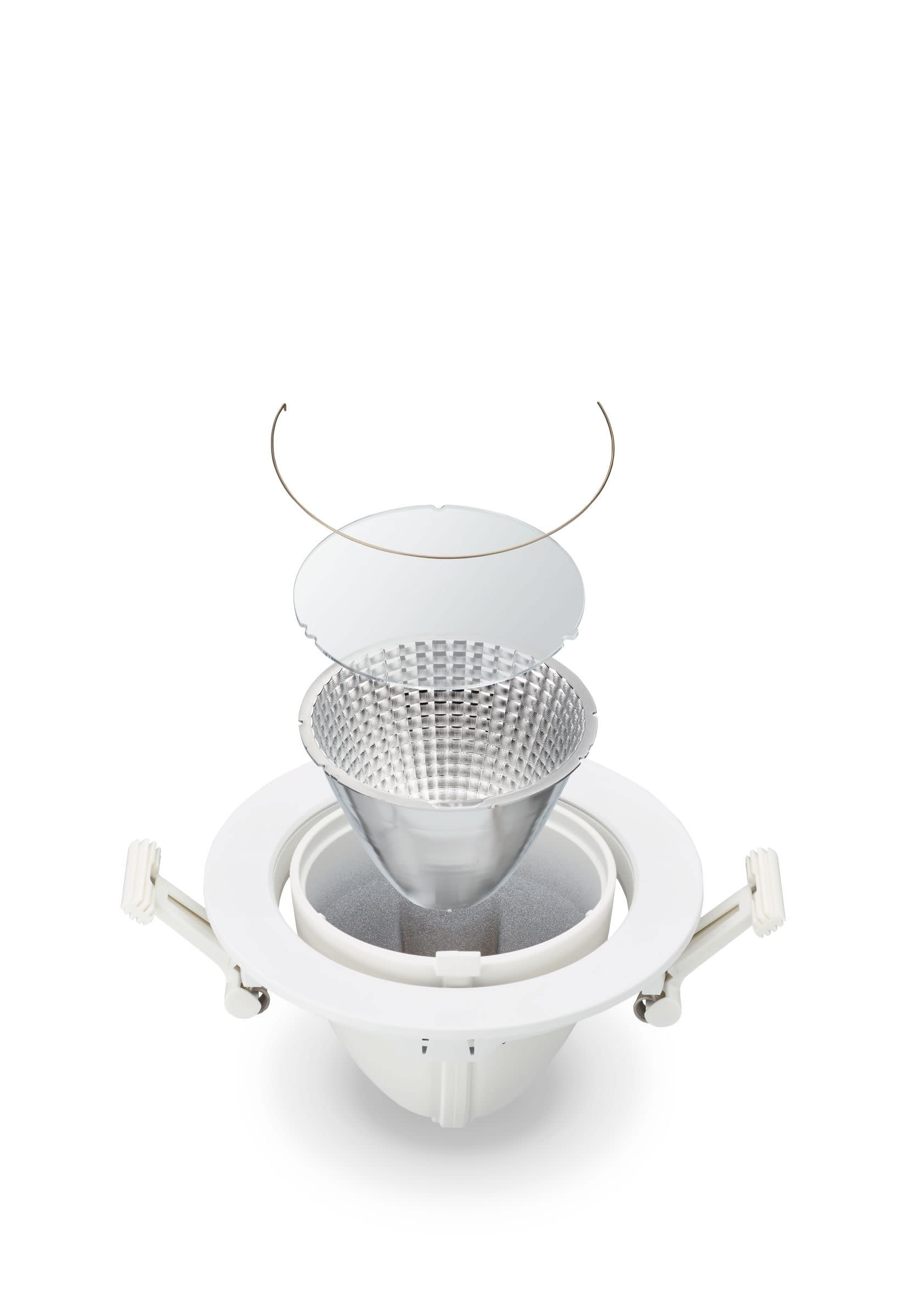 C/O D150 mm, Aluminium, Blanc, Poudrage simple couche, Système Interact Ready de gradation Dali, compatible communication par la lumière visible pour éclairage externe, 3900 lm, 31 W, 126 lm/W, PremiumWhite, 3000 K, (0.422, 0.386) SDCM 2, CRI90, Faisceau extensif, Réflecteur PerfectAccent, IP20 | Protection des doigts, IK02 | 0,2 J standard, Classe de sécurité II, 2 connecteurs à poussoir 2 pôles, TP(a) diffuser flammability class