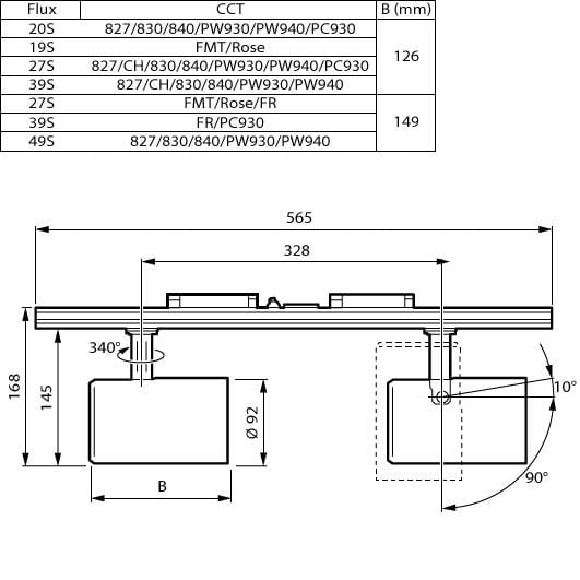 Polycarbonate, Blanc, Bloc d’alimentation électrique (Marche/Arrêt), 8000 lm, 59 W, 134 lm/W, 3000 K, (0.434, 0.403), Faisceau extensif, IP20 | Protection des doigts, IK02 | 0,2 J standard, Classe de sécurité II, Rail
