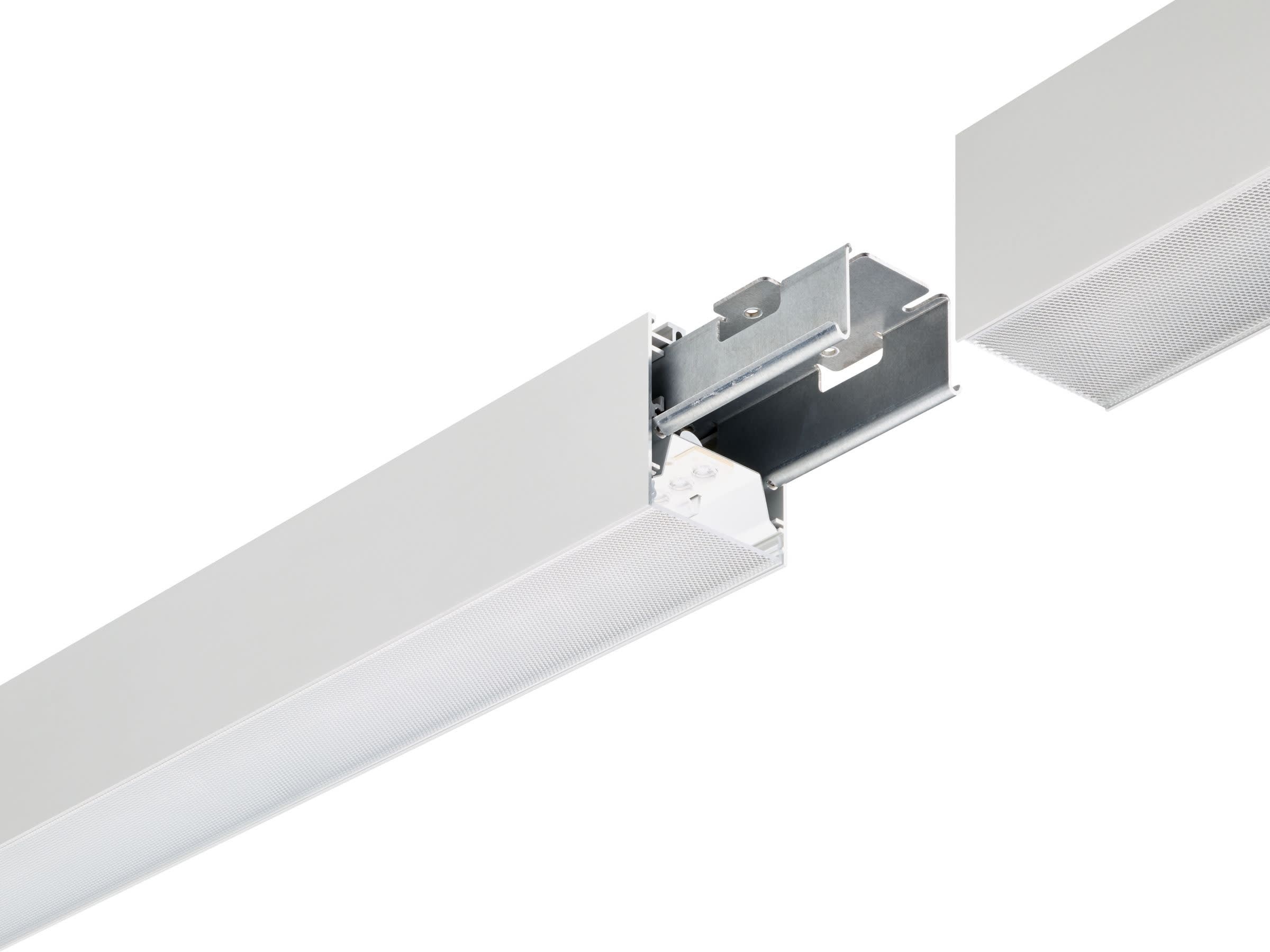 L1200 mm; H70 mm, Aluminium, Aluminium, Bloc d'alimentation avec interface DALI, 2600 lm, 21 W, 130 lm/W, 3000 K, (0.43, 0.40) SDCM 3, UGR19, Faisceau semi-intensif, Texturé, Polycarbonate, IP20 | Protection des doigts, IK06 | 1 J, Classe électrique I, Connecteur à poussoir 5 pôles