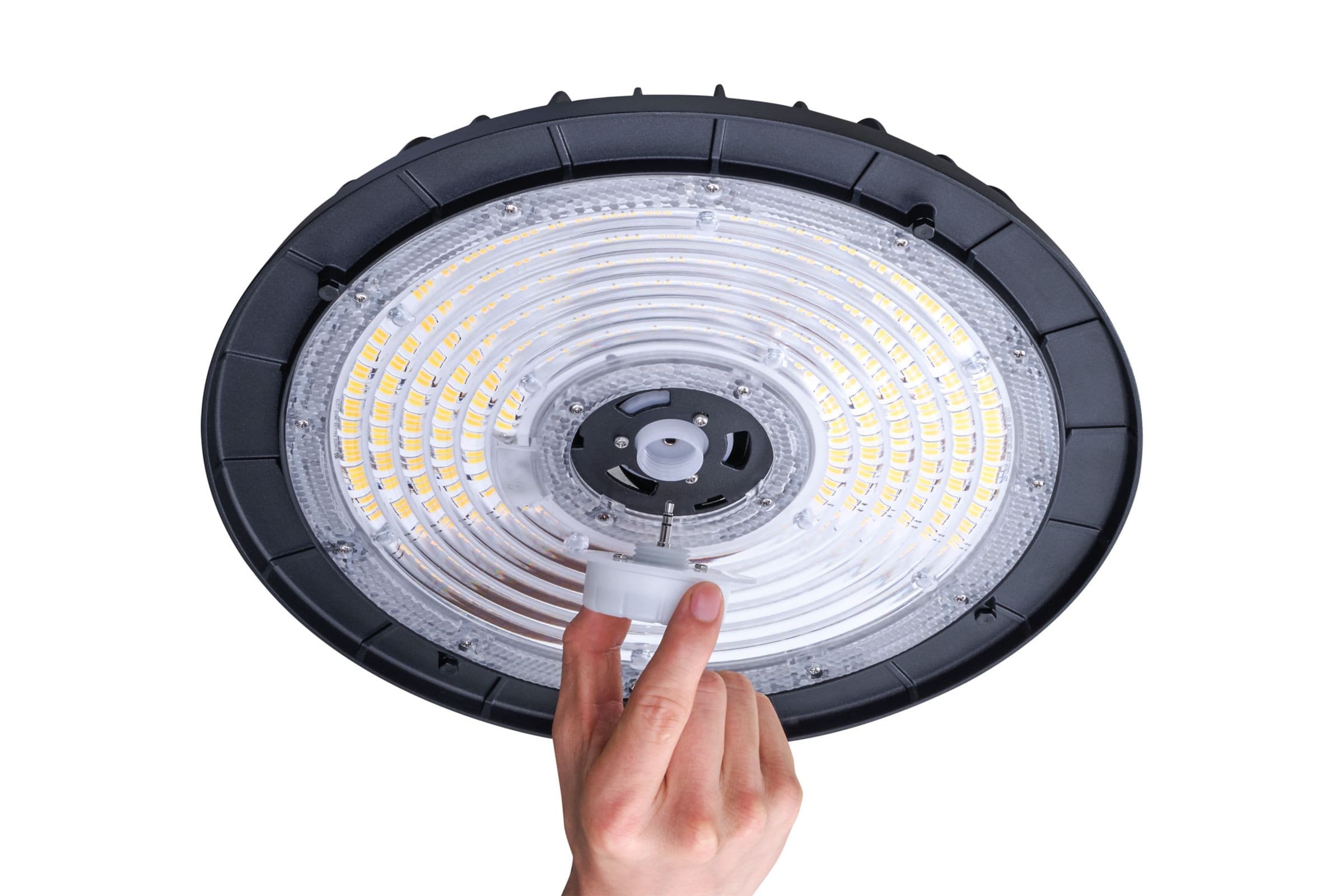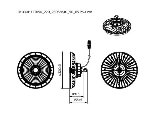 ɸ320 mm, Fonte d’aluminium, Aluminium et noir, Noir jais (RAL9005), Poudrage simple couche, Suspension, Bloc d’alimentation, All-in, Multi Lumen, All-in, Multi Color Temperature, 15000 lm, 22000 lm, 28000 lm, 195 W, 145 W, 100 W, 142 lm/W, 147 lm/W, 155 lm/W, 4000 K, 5000 K, 6500 K, (0.38, 0.38); (0.31, 0.34) SDCM≤5, Symétrique, Transparent, Polycarbonate, IP65 | Protection contre la pénétration de poussière, protection contre les jets d’eau, IK07 | 2 J renforcé, Classe électrique I, Connecteur à visser