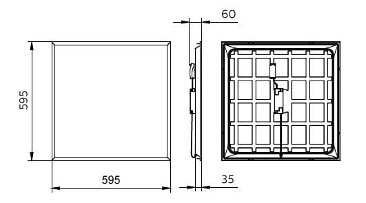 600x600 mm, Acier, Blanc, Blanc de sécurité (RAL9003), Bloc d’alimentation électrique (Marche/Arrêt), 3400 lm, 34 W, 100 lm/W, 4000 K, (0.38, 0.38) SDCM≤5, UGR19, Angle d’ouverture de faisceau 90°, Lentille microprismatique, Acrylate, Protection des doigts, 0,2 J standard, Classe de sécurité II, Connecteur à poussoir 2 pôles