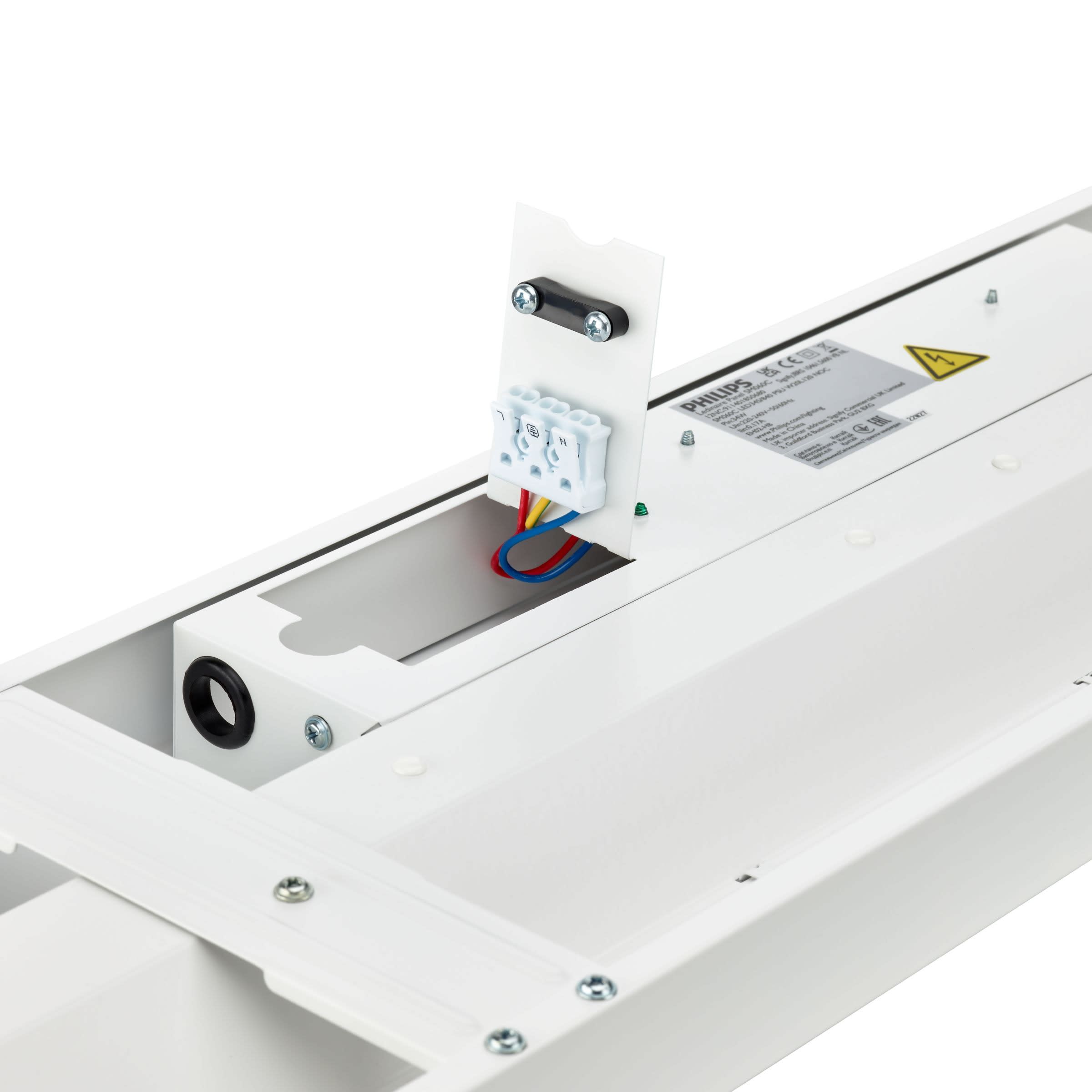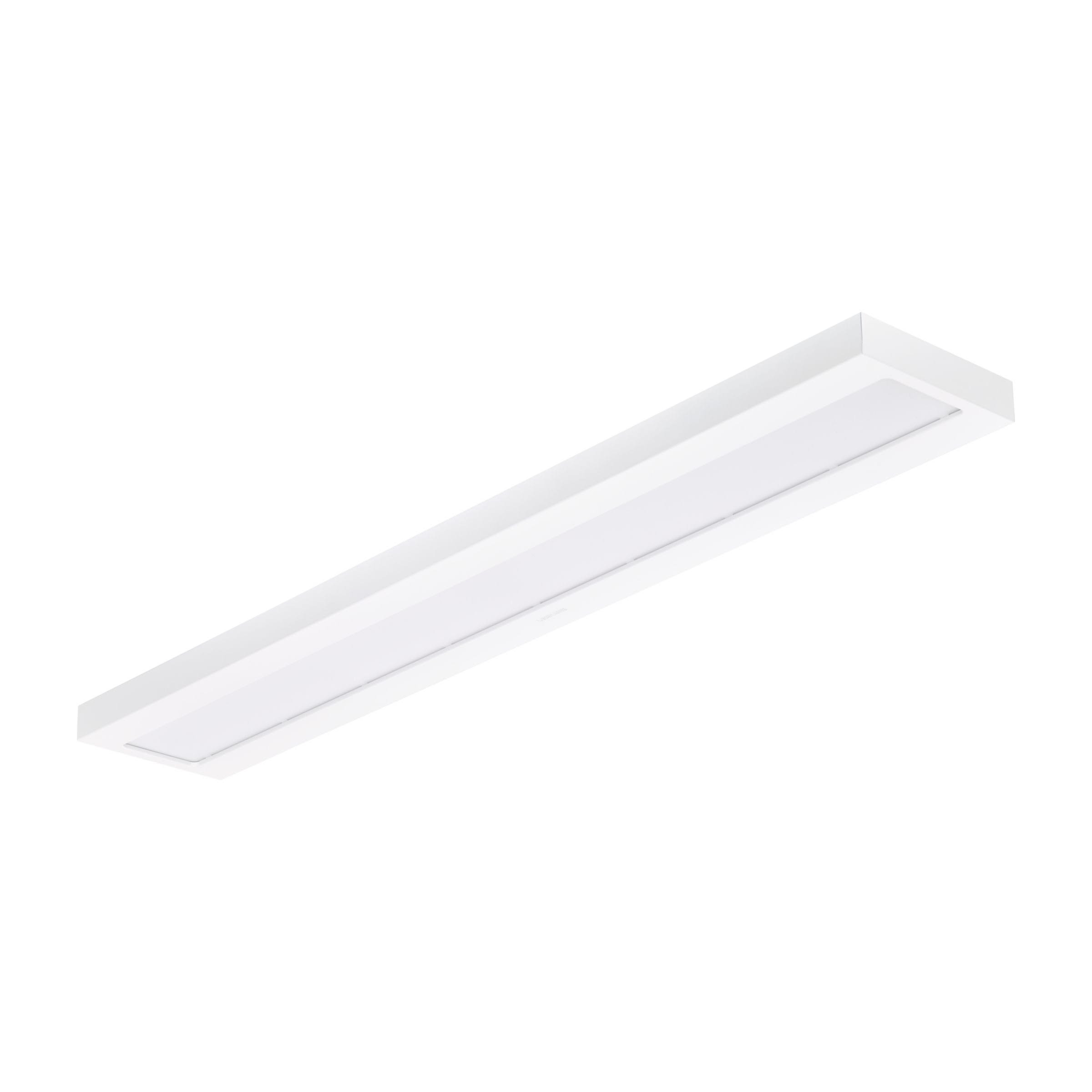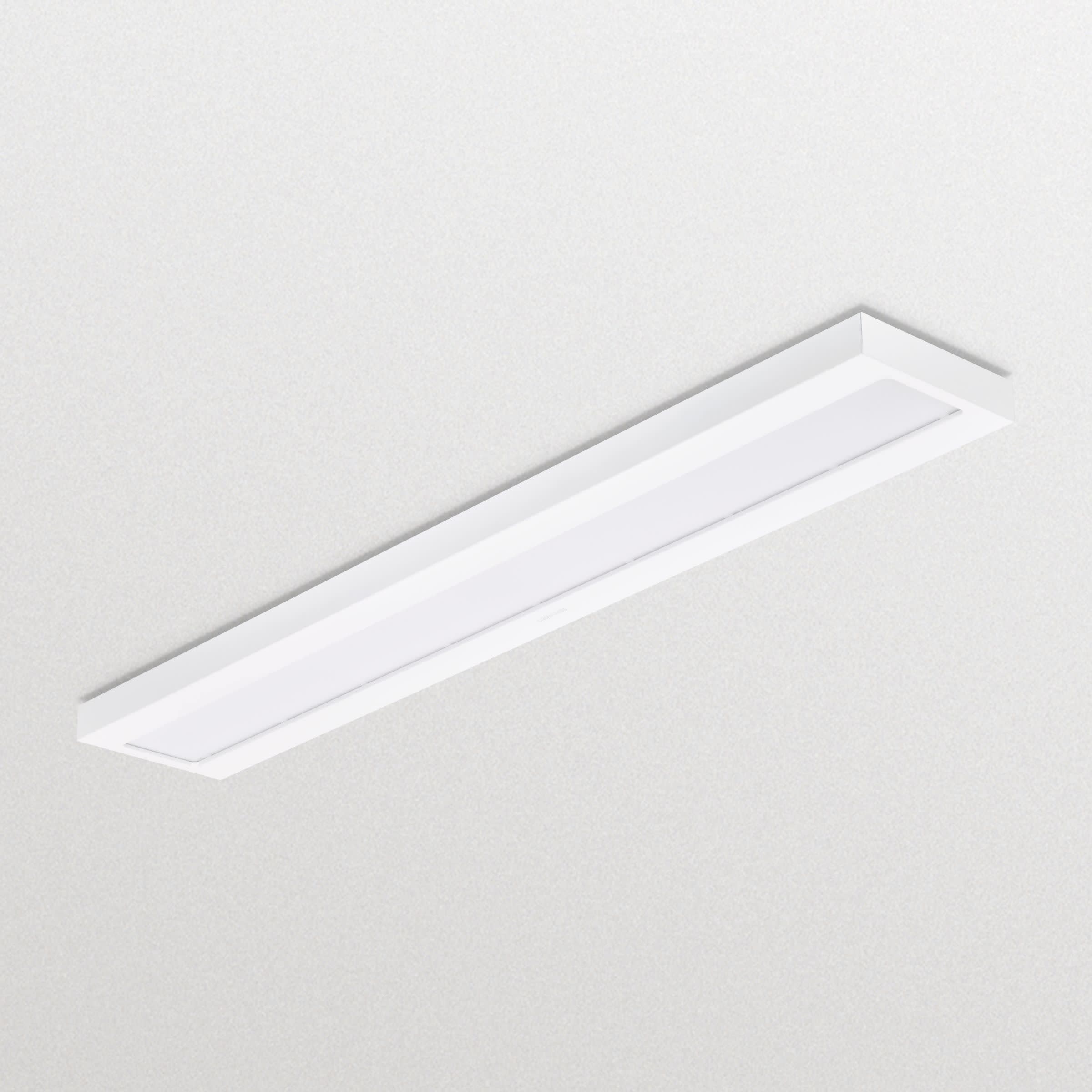 1200x200 mm, Acier, Blanc, Blanc de sécurité (RAL9003), Bloc d’alimentation électrique (Marche/Arrêt), 3400 lm, 34 W, 100 lm/W, 4000 K, SDCM5, UGR19, Angle d’ouverture de faisceau 90°, Opale, Acrylate et polycarbonate, IP20 | Protection des doigts, IK03 | 0,3 J, Classe électrique I, Connecteur à poussoir 3 pôles