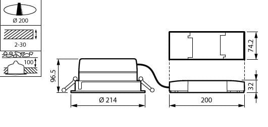 D200 mm, Aluminium moulé sous pression, Blanc, Blanc de sécurité (RAL9003), Bloc d'alimentation externe (Marche/Arrêt), 2200 lm, 14.8 W, 149 lm/W, 4000 K, (0.38, 0.38) SDCM≤2, Réflecteur brillant, Transparent, Verre, IP20/54 | Protection des doigts ; protection contre l’accumulation de poussière, protection contre les éclaboussures, IK02 | 0,2 J standard, Classe de sécurité II, Connecteur à poussoir et soulagement de traction