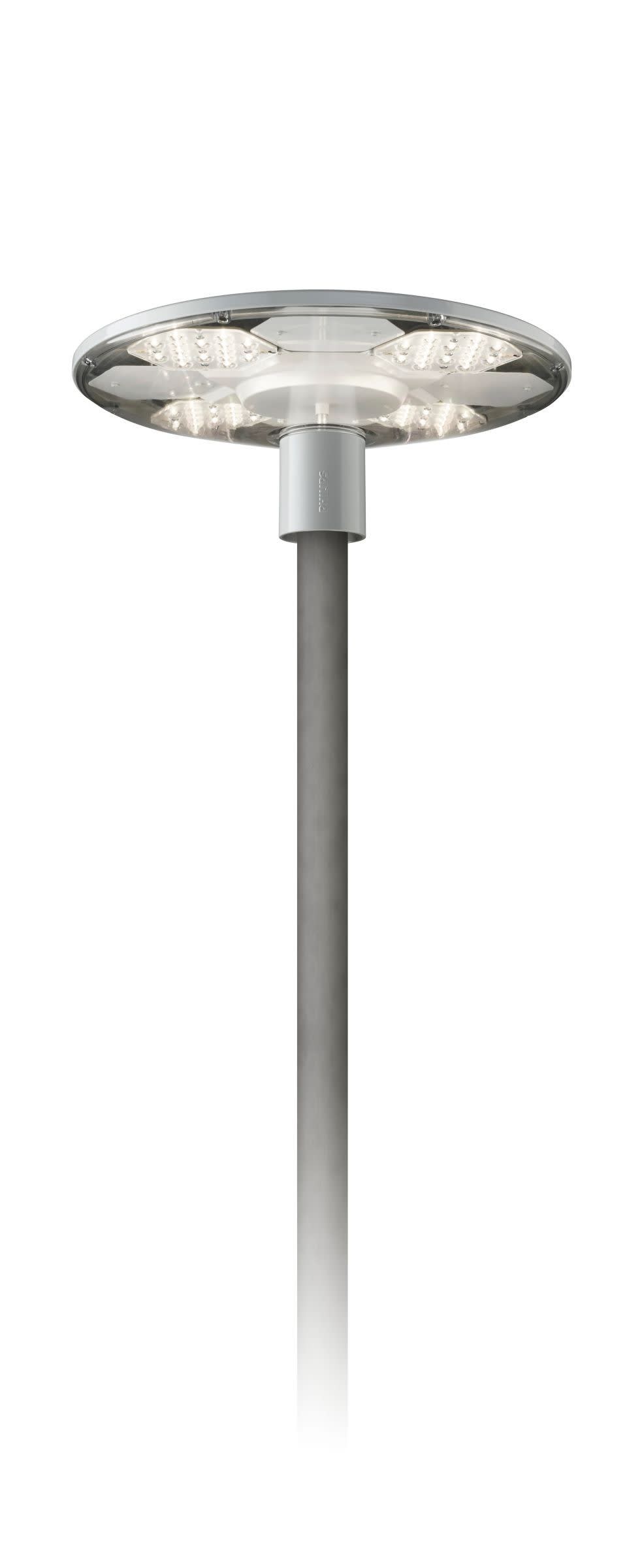 Urban road & street light, Aluminium, Argent, Top de mât pour diamètre 62 mm, Bloc d'alimentation avec DynaDimmer, Gradation LumiStep 6 heures, 3800 lm, 41 W, 93 lm/W, 3000 K, (0.43, 0.40) SDCM 5, CRI80, Distribution symétrique, IP66 | Protection contre la pénétration de poussière, protection contre les jets d’eau, IK10 | 20 J résistance au vandalisme, Classe de sécurité II, Protection contre les surtensions en mode différentiel jusque 6 kV et en mode commun jusque 6 kV, Bornier de raccordement à vis 5 pôles