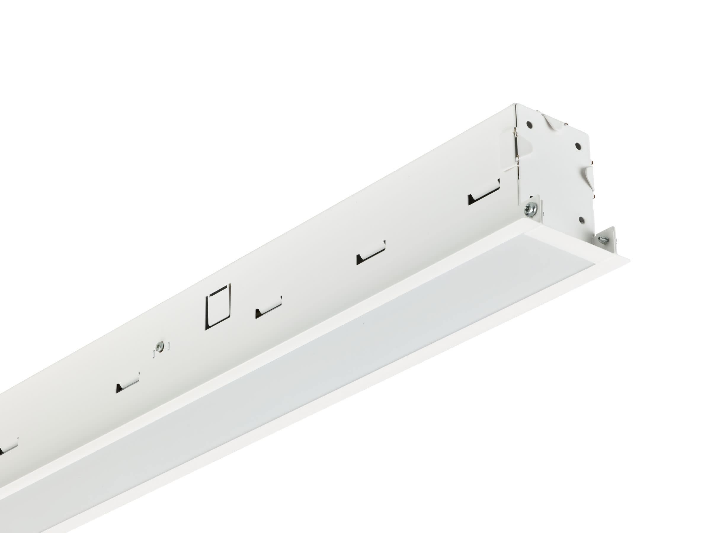 1130x80 mm, Plaster ceiling version, Acier, Blanc, Blanc de sécurité (RAL9003), Bloc d'alimentation avec interface DALI, 3400 lm, 24.5 W, 145 lm/W, 4000 K, (0.38, 0.38) SDCM 3, CRI90, UGR19, Faisceau extensif, Optique structurée, Polyméthacrylate de méthyle, IP20/40 | Protection des doigts ; protection des fils, IK03 | 0,35 J renforcé, Classe électrique I, Connecteur à poussoir 5 pôles, SC | Câble de sécurité