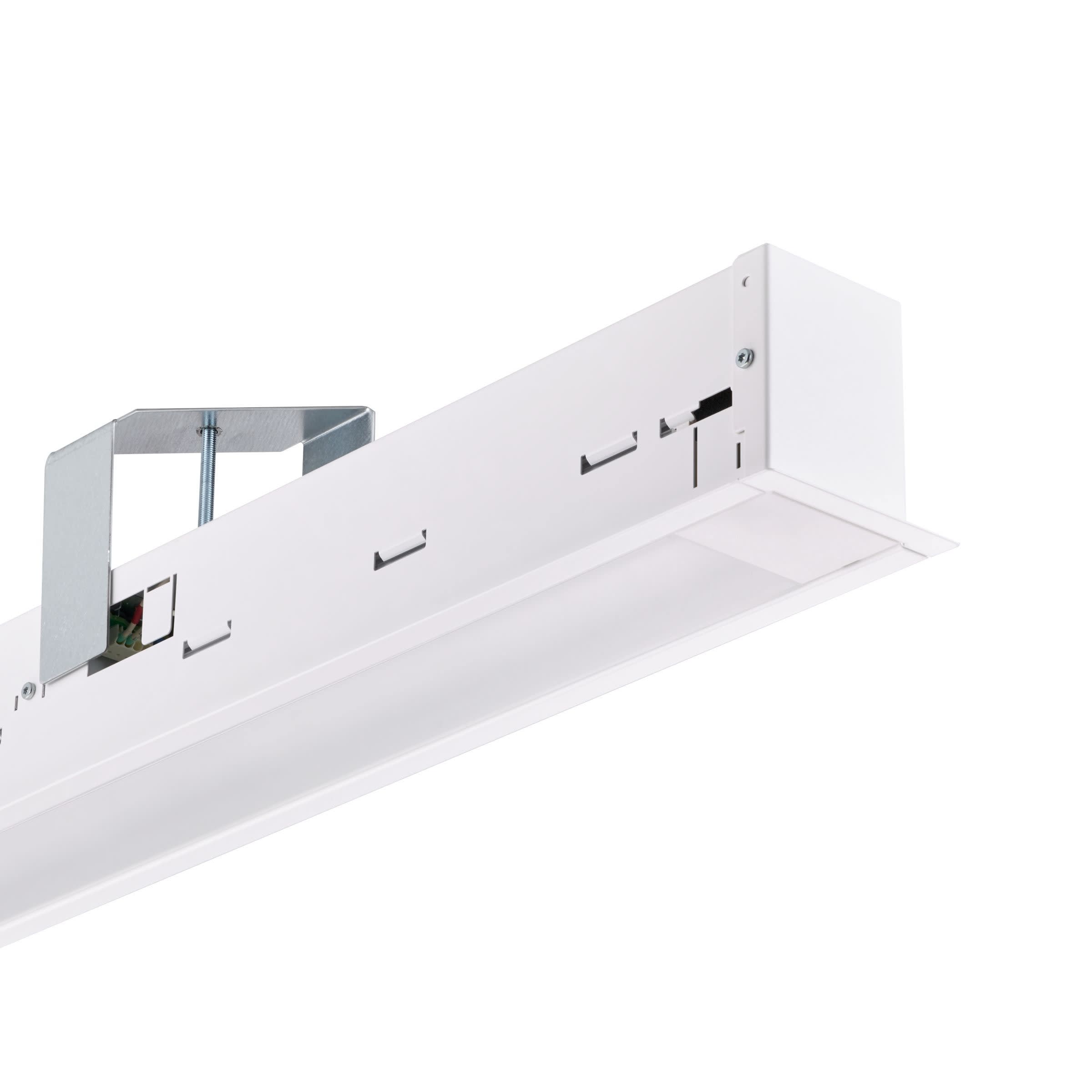 1130x80 mm, Plaster ceiling version, Acier, Blanc, Blanc de sécurité (RAL9003), Système Interact Ready de gradation Dali, 4000 lm, 33 W, 121 lm/W, Tunable white 2700-6500 K, (0.38, 0.38) SDCM 3, CRI90, UGR19, Faisceau extensif, Optique structurée, Polyméthacrylate de méthyle, IP20/40 | Protection des doigts ; protection des fils, IK03 | 0,35 J renforcé, Classe électrique I, Connecteur à poussoir 5 pôles
