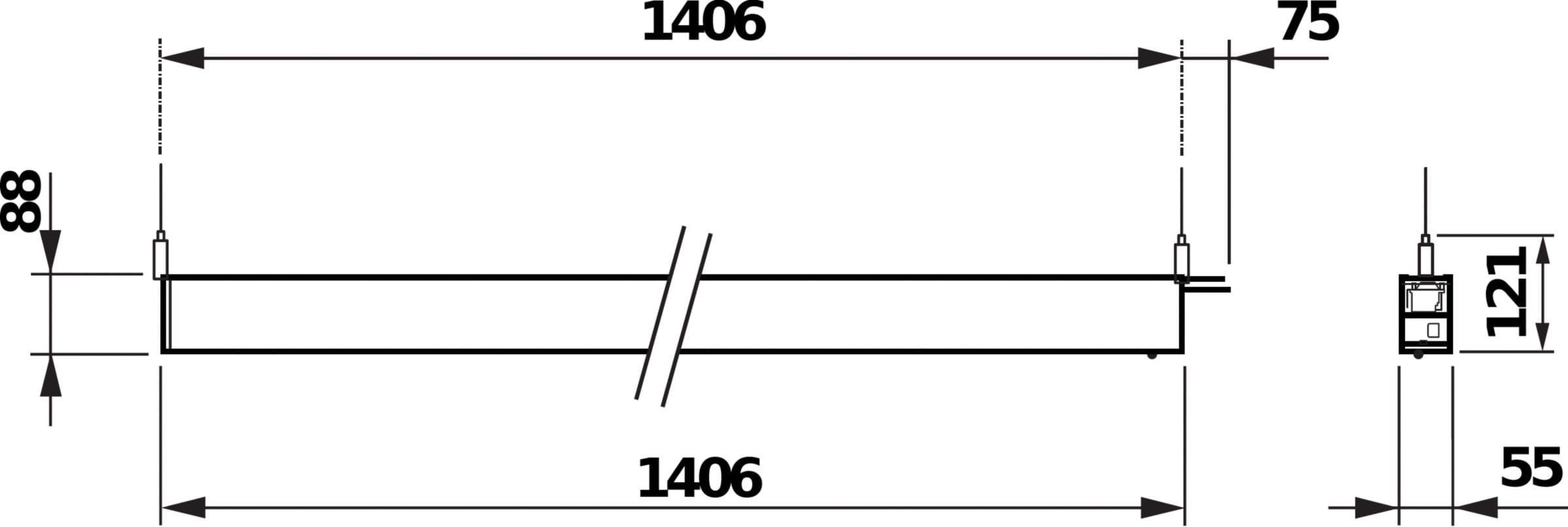 1410x55 mm; H88 mm, Aluminium, Aluminium, Bloc d'alimentation avec interface DALI, 2900 lm, 21 W, 138 lm/W, 4000 K, (0.38, 0.38) SDCM 3, CRI90, UGR13, Faisceau extensif, Dépoli, Polyméthacrylate de méthyle, IP20 | Protection des doigts, IK03 | 0,35 J renforcé, Classe électrique I, Connecteur à poussoir 5 pôles