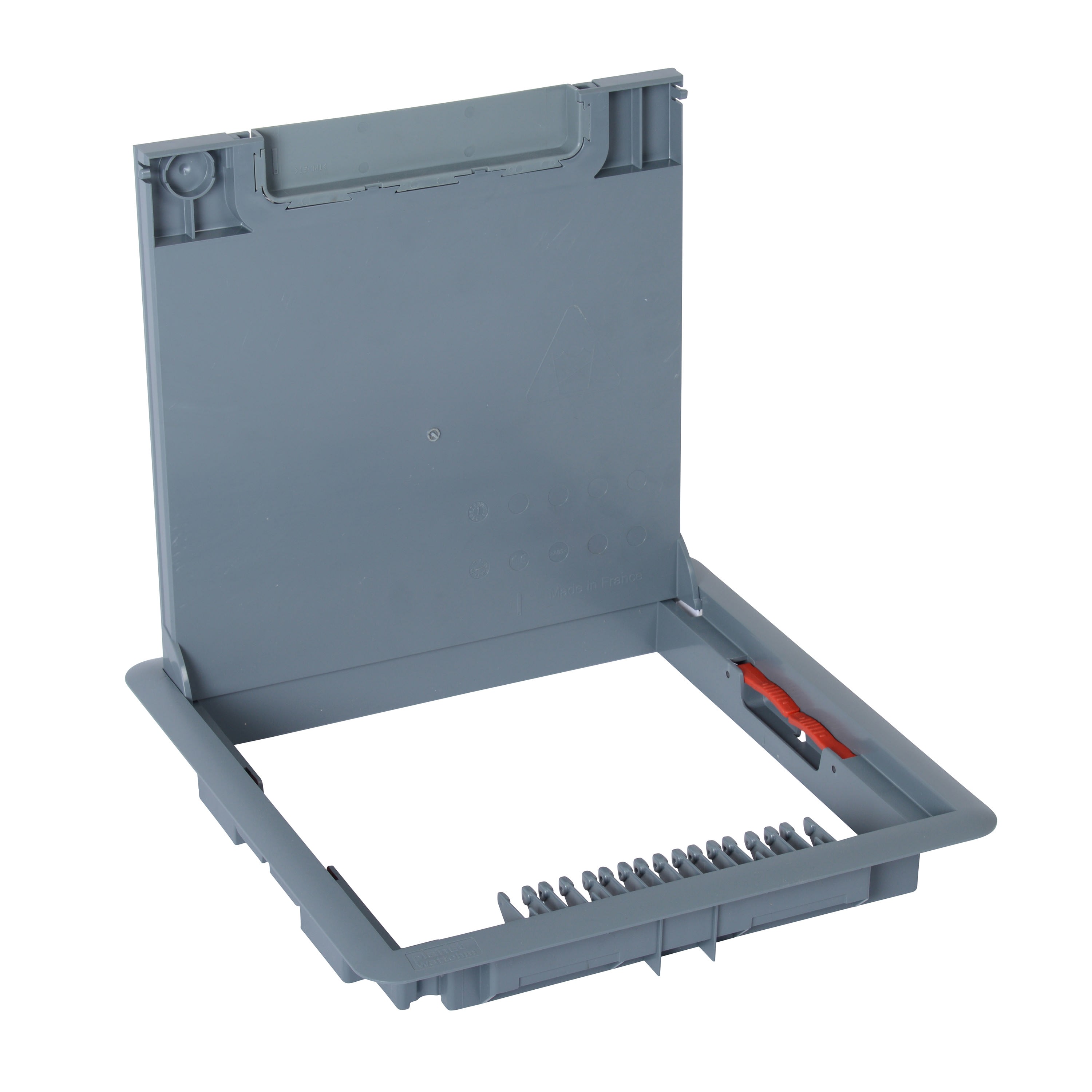 Le cadre + couvercle permet l'accès et la connexion aux prises électriques, audio-vidéo et VDI contenus dans la boîte de sol standard, puis sa fermeture avec cordons connectés en toute sécurité.A associer à un kit support appareillage.
