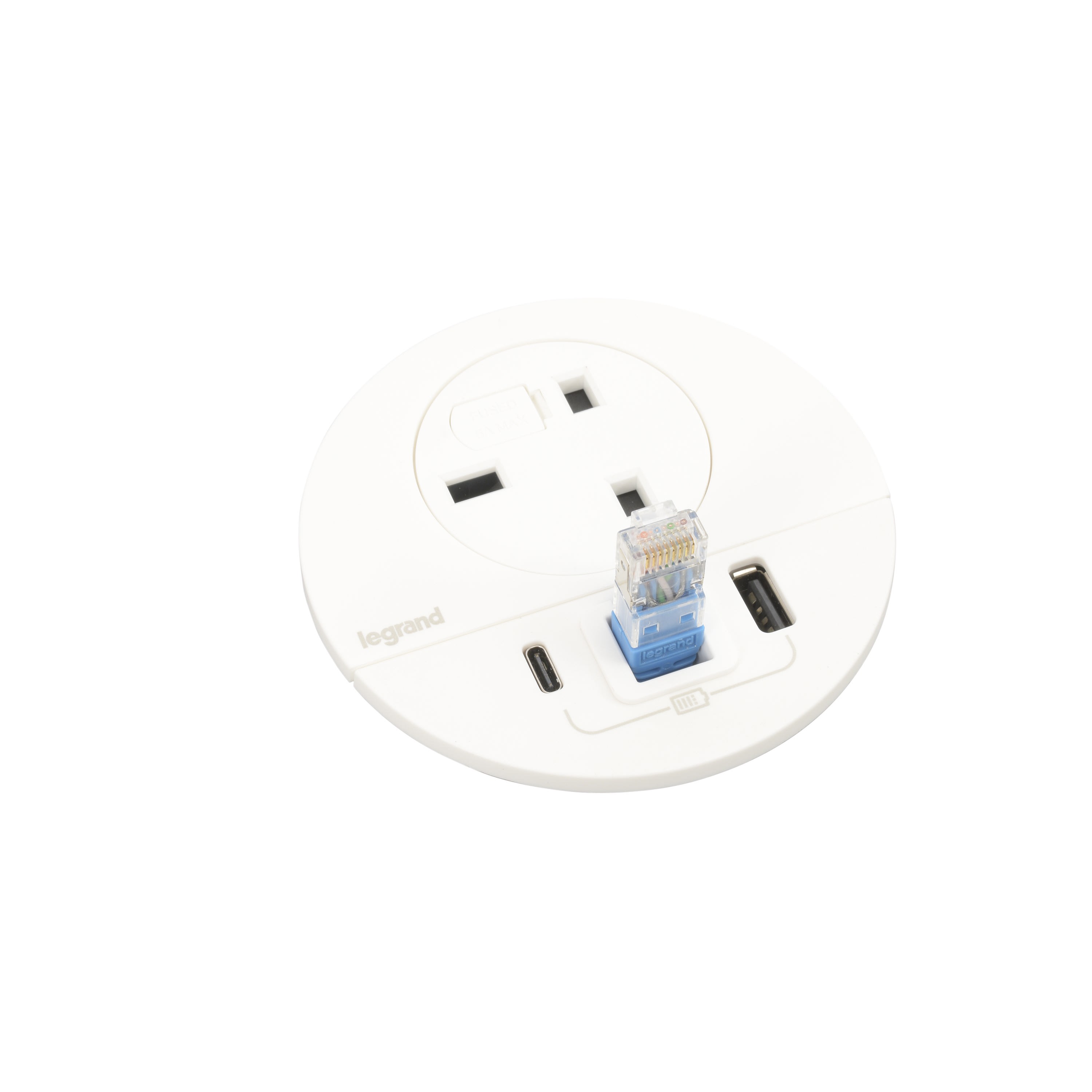 Incara Disq 80, solution pensée pour les travailleurs nomades, s'intègre dans un perçage de diamètre 79mm en proposant une prise de courant, un chargement USB et un accès réseau dans un encombrement réduit