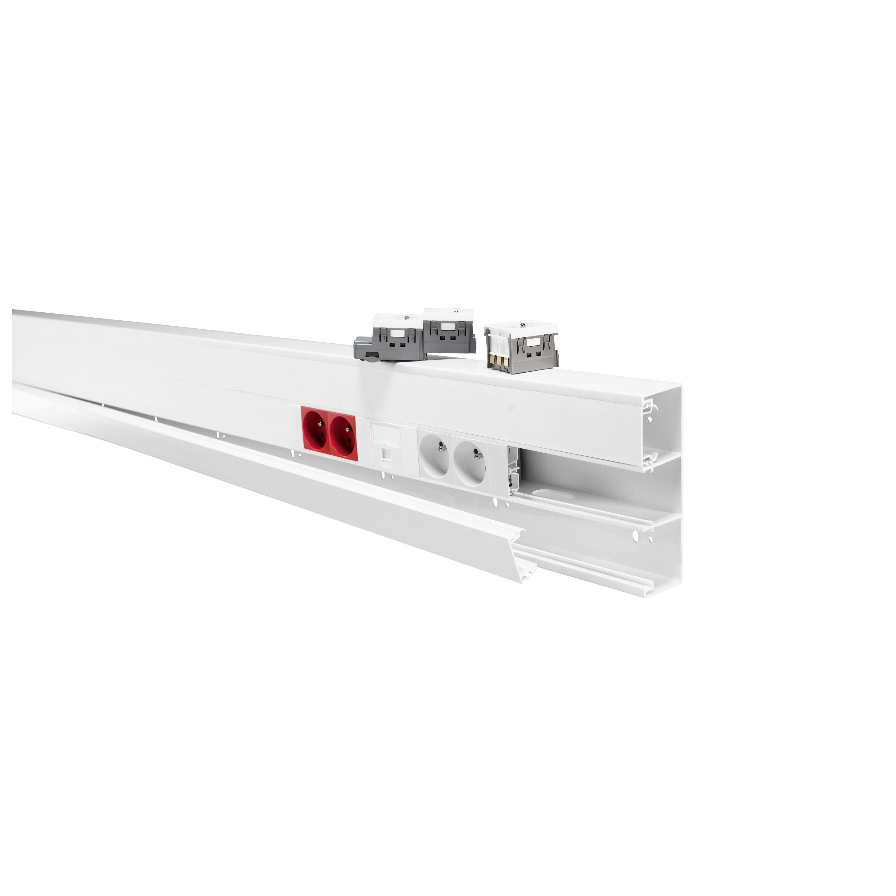 Goulotte d'installation Reçoit l’appareillage format 45x45 (type appareillage Logix) par simple clipsage, conférant à cet ensemble rapidité de mise en œuvre et d’évolutivité Spécialement conçue pour les installations périmétriques permettant le cheminement des courants forts et faibles dans les bâtiments tertiaires