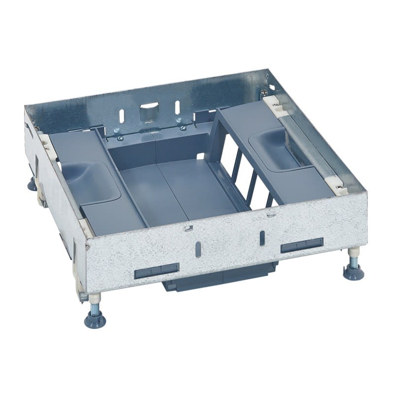 Equipé de quatre pieds réglables en hauteur jusque 122mm. Au-delà, utiliser l'accessoire réf PW28601 (maxi 300mm) Le montage vertical de l'appareillage apporte une solution idéale en cas de faible profondeur du sol (à partir de 80mm) car il permet de brancher tous types de fiches (y compris les fiches droites). Particulièrement adapté en rénovation. Supports compatibles avec les gammes d'appareillage planet wattohm Logix.