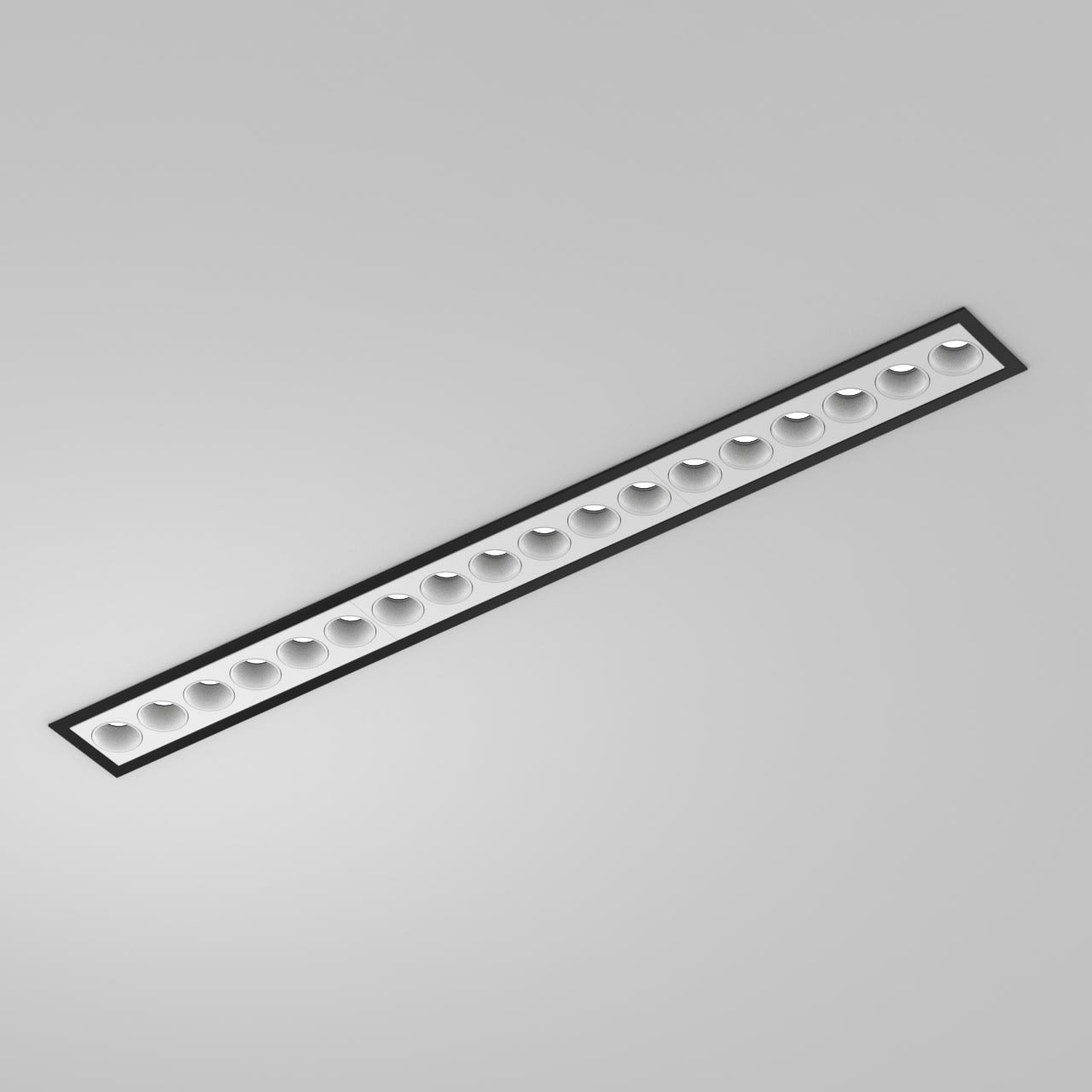 Luminaire pour montage encastré, de grande qualité, en aluminium extrudé, anti-éblouissement en polycarbonate. Luminaire équipé de 18 points lumineux avec LED haute puissance de grande efficacité dans la combinaison de couleurs : Tube anti-éblouissant white matte, Masque white matte, Boîtier revêtu par poudre noir RAL9005, structure fine mate. Avec technologie de lentille haut de gamme avec optique en retrait. Direct Type de Diffusion, Géométrie lumineuse symétrique avec un angle de ayonnement ’Medium’ de 30°. Luminaire équipé d’une technologie LED innovante avec une efficacité de 77 lm par W et une flux lumineux sortant de 3166 lm lm pour 41 W, en température de couleur 4000 K. Nombre d´adresses DALI : 1. Convertisseur DALI pour gradation, Evaluation de l’éblouissement selon la classification selon DIN EN 12464-1.2021-11 avec UGR < 16, Indice de rendu des couleurs (IRC) > 90, tolérance chromatique étroite MacAdam 3, Groupe de risque RG1 selon norme IEC 62471, durée de vie nominale > 50.000 h [selon le décret de l’UE], classe énergétique (EEI). Indice de protection IP20, classe de protection I. Raccordement électrique par pôles utilisés. Embouts inclus4 ressorts de montage. Option de commutateur : C, source lumineuse remplaçable par le fabricant, dispositif de commande remplaçable par un professionnel autorisé, Dimensions LxlxH : 556x56x043 mm, Découpe LxlxH : 550x49x080 mm, Poids : 0,9 kg