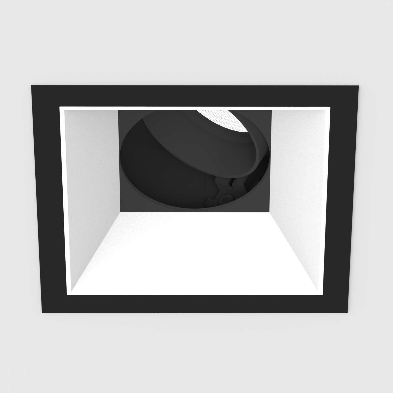 Projecteur carré encastré Led en aluminium moulé sous pression thermolaqué boîtier/cadre noir mat et Cône anti-éblouissement noir mat, réflecteur secondaire blanc mat. La technologie LED de dernière génération avec un flux lumineux de1866 lm pour21 W Distribution symétrique dans la température de couleur de 3000 K. Caractéristique de rayonnement : un faisceau ’wide flood’ en 50 °. la tête du réflecteur peut être pivotée de 30°, tournée de 355°, Projecteur complet incluant réflecteur et Reflectors and Converter, Indice de rendu des couleurs (IRC) > 90, Evaluation de l'éblouissement selon la classification selon DIN EN 12464-1.2021-11 avec UGR < 19, luminaire de poste de travail compatible écran selon DIN EN 12464-1 (luminosité à 65° <= 3000 cd/m²), Durée de vie nominale > 60.000 h [selon le décret de l’UE]. Indice de protection IP20, classe de protection II. Remplacement du réflecteur secondaire possible sans outils. Peut être commandé en plus avec un capteur externe de mouvement et de lumière du jour. Sur demande également en version d’éclairage d’urgence, batterie 3h. Option de commutateur : A, Dimensions : LxlxH : 107x107x121 mm, Découpe LxlxH : 96x96x171 mm, Poids : 0,5 kg