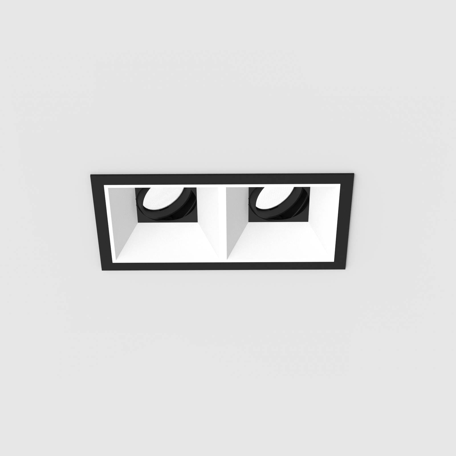 Projecteurs carré s encastré Led en disposition linéaire 1 x 2 en aluminium moulé sous pression thermolaqué boîtier/cadre noir mat et Cône anti-éblouissement noir mat, réflecteur secondaire blanc mat. La technologie LED de dernière génération avec un flux lumineux de 2 x 995 lm pour 2 x 13,5 W Distribution symétrique dans la température de couleur de 4000 K. Caractéristique de rayonnement : un faisceau ’flood’ en 42 °. têtes de réflecteur 30° pivotant, 355° rotatif, Projecteur complet incluant réflecteur et Reflector and Converter DALI dimmable, Nombre d’adresses DALI : 2, Indice de rendu des couleurs (IRC) > 90, Evaluation de l'éblouissement selon la classification selon DIN EN 12464-1.2021-11 avec UGR < 16, luminaire de poste de travail compatible écran selon DIN EN 12464-1 (luminosité à 65° <= 1000 cd/m²), Durée de vie nominale > 60.000 h [selon le décret de l’UE]. Indice de protection IP20, classe de protection II. Remplacement du réflecteur secondaire possible sans outils. Peut être commandé en plus avec un capteur externe de mouvement et de lumière du jour. Sur demande également en version d’éclairage d’urgence, batterie 3h. Option de commutateur : C, Dimensions : LxlxH : 142x78x098 mm, Découpe LxlxH : 134x68x148 mm, Poids : 0,9 kg