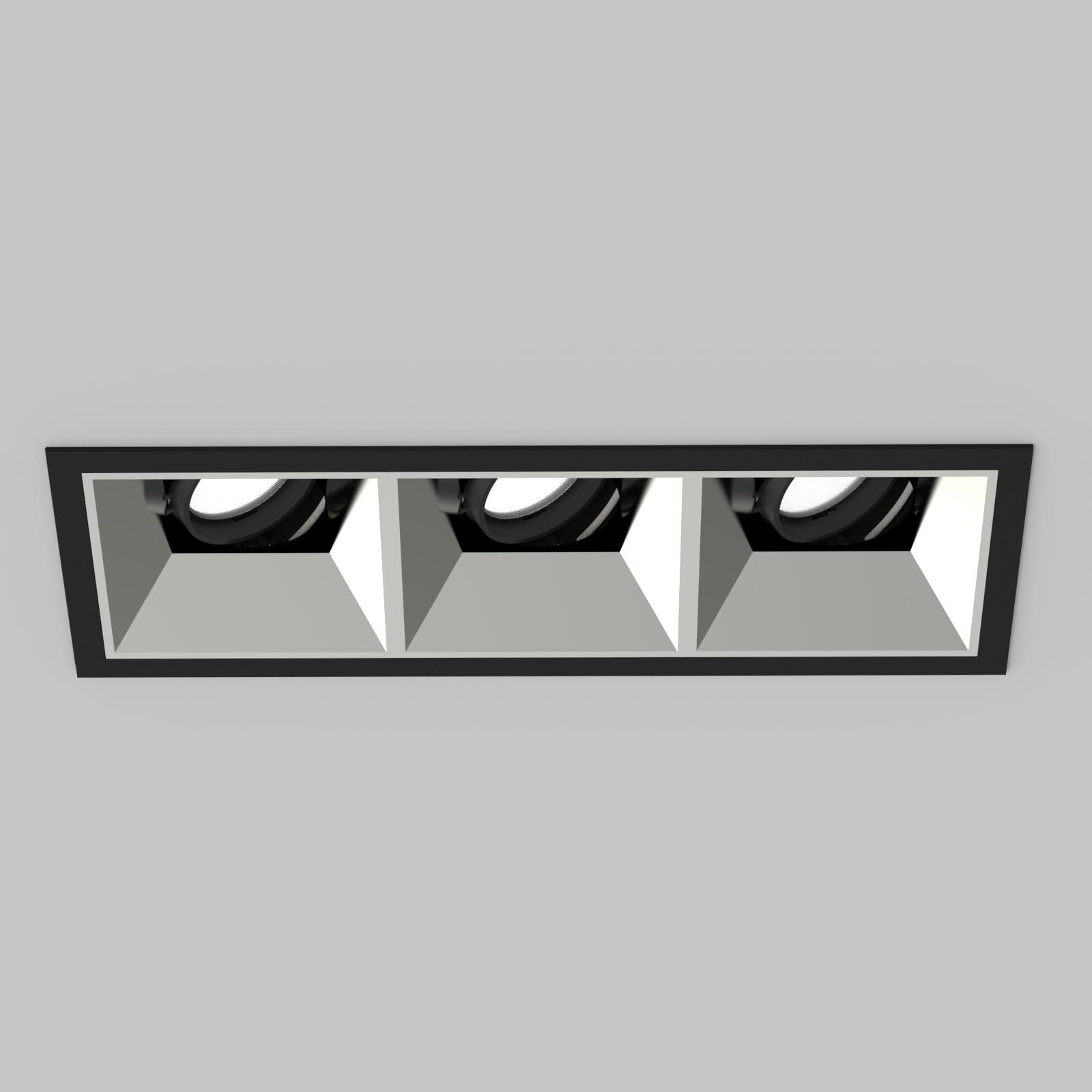 Projecteurs carré s encastré Led en disposition linéaire 1 x 3 en aluminium moulé sous pression thermolaqué boîtier/cadre noir mat et Cône anti-éblouissement noir mat, réflecteur secondaire argent brillant. La technologie LED de dernière génération avec un flux lumineux de 3 x 824 lm pour 3 x 13,5 W Distribution symétrique dans la température de couleur de 3000 K. Caractéristique de rayonnement : un faisceau ’medium’ en 24 °. têtes de réflecteur 30° pivotant, 355° rotatif, Projecteur complet incluant réflecteur et Reflector and Converter DALI dimmable, Nombre d’adresses DALI : 3, Indice de rendu des couleurs (IRC) > 90, Evaluation de l'éblouissement selon la classification selon DIN EN 12464-1.2021-11 avec UGR < 16, luminaire de poste de travail compatible écran selon DIN EN 12464-1 (luminosité à 65° <= 1000 cd/m²), Durée de vie nominale > 60.000 h [selon le décret de l’UE]. Indice de protection IP20, classe de protection II. Remplacement du réflecteur secondaire possible sans outils. Peut être commandé en plus avec un capteur externe de mouvement et de lumière du jour. Sur demande également en version d’éclairage d’urgence, batterie 3h. Option de commutateur : C, Dimensions : LxlxH : 207x78x098 mm, Découpe LxlxH : 198x68x148 mm, Poids : 1,3 kg