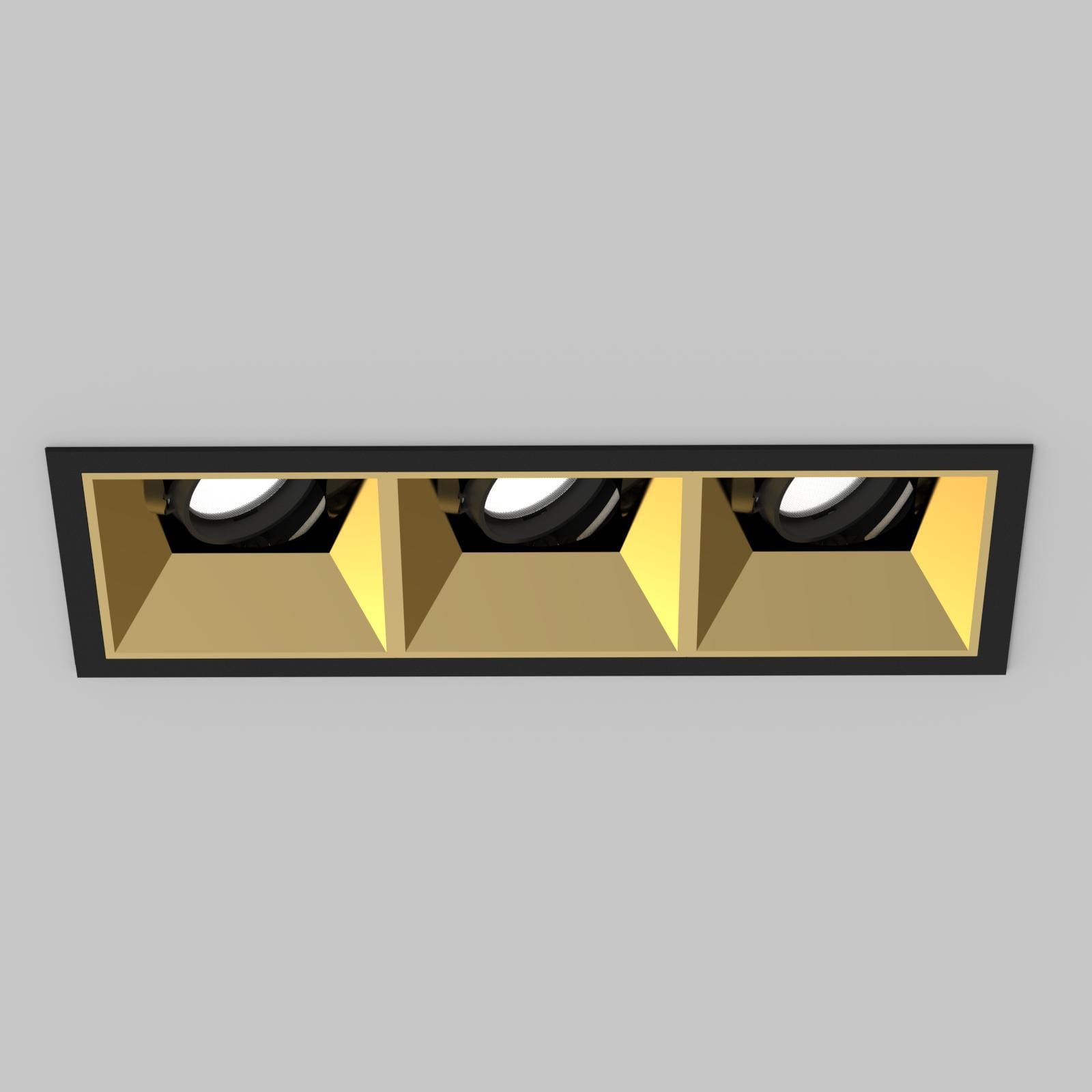 Projecteurs carré s encastré Led en disposition linéaire 1 x 3 en aluminium moulé sous pression thermolaqué boîtier/cadre noir mat et Cône anti-éblouissement noir mat, réflecteur secondaire or brillant. La technologie LED de dernière génération avec un flux lumineux de 3 x 652 lm pour 3 x 9,8 W Distribution symétrique dans la température de couleur de 4000 K. Caractéristique de rayonnement : un faisceau ’medium’ en 24 °. têtes de réflecteur 30° pivotant, 355° rotatif, Projecteur complet incluant réflecteur et Reflector and Converter, Indice de rendu des couleurs (IRC) > 90, Evaluation de l'éblouissement selon la classification selon DIN EN 12464-1.2021-11 avec UGR < 16, luminaire de poste de travail compatible écran selon DIN EN 12464-1 (luminosité à 65° <= 1000 cd/m²), Durée de vie nominale > 60.000 h [selon le décret de l’UE]. Indice de protection IP20, classe de protection II. Remplacement du réflecteur secondaire possible sans outils. Peut être commandé en plus avec un capteur externe de mouvement et de lumière du jour. Sur demande également en version d’éclairage d’urgence, batterie 3h. Option de commutateur : A, Dimensions : LxlxH : 207x78x098 mm, Découpe LxlxH : 198x68x148 mm, Poids : 1,3 kg