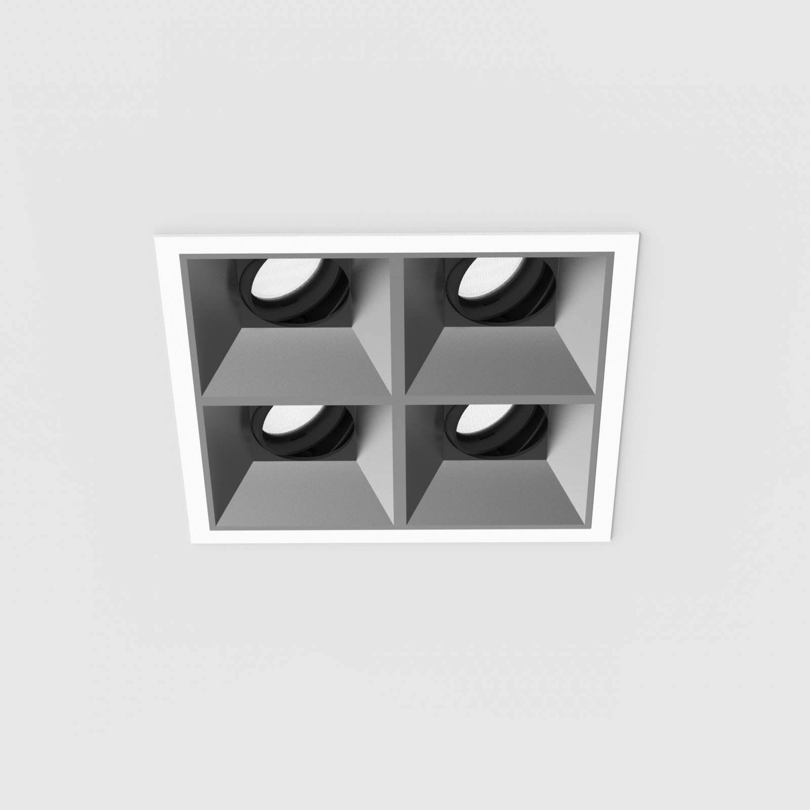 Projecteurs carré s encastré Led en disposition carrée 2 x 2 en aluminium moulé sous pression thermolaqué boîtier/cadre blanc mat et Cône anti-éblouissement noir mat, réflecteur secondaire argent mat. La technologie LED de dernière génération avec un flux lumineux de 4 x 909 lm pour 4 x 13,5 W Distribution symétrique dans la température de couleur de 3000 K. Caractéristique de rayonnement : un faisceau ’flood’ en 42 °. têtes de réflecteur 30° pivotant, 355° rotatif, Projecteur complet incluant réflecteur et Reflector and Converter DALI dimmable, Nombre d’adresses DALI : 4, Indice de rendu des couleurs (IRC) > 90, Evaluation de l'éblouissement selon la classification selon DIN EN 12464-1.2021-11 avec UGR < 16, luminaire de poste de travail compatible écran selon DIN EN 12464-1 (luminosité à 65° <= 1000 cd/m²), Durée de vie nominale > 60.000 h [selon le décret de l’UE]. Indice de protection IP20, classe de protection II. Remplacement du réflecteur secondaire possible sans outils. Peut être commandé en plus avec un capteur externe de mouvement et de lumière du jour. Sur demande également en version d’éclairage d’urgence, batterie 3h. Option de commutateur : C, Dimensions : LxlxH : 142x142x098 mm, Découpe LxlxH : 134x134x148 mm, Poids : 1,7 kg