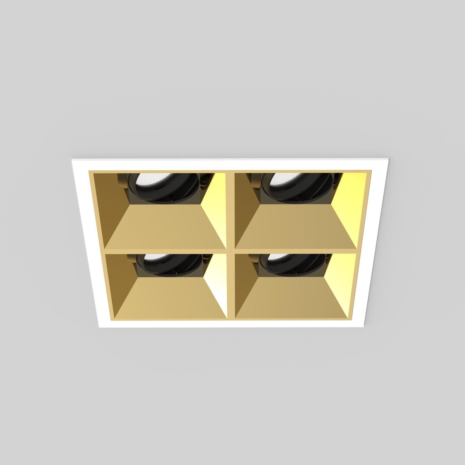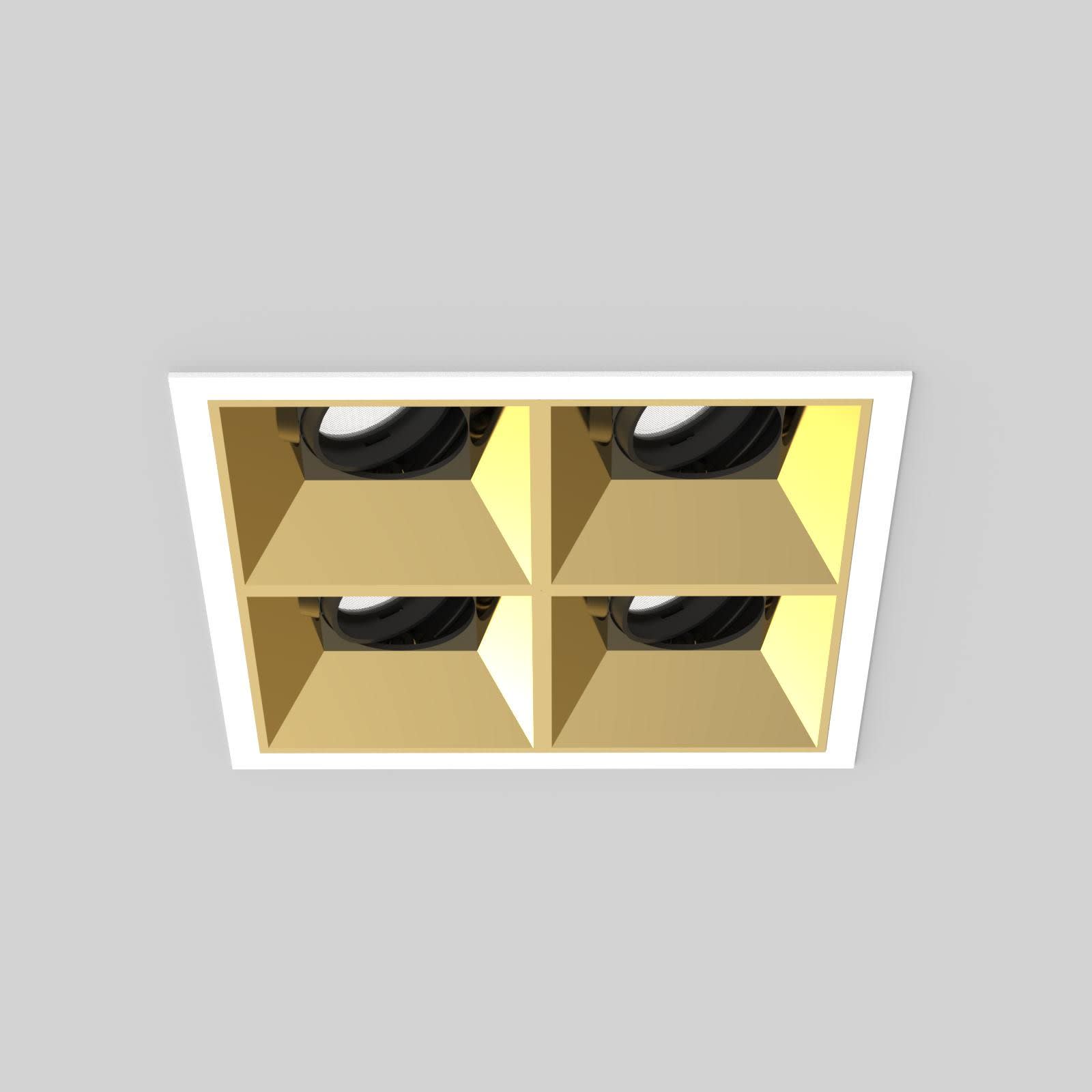 Projecteurs carré s encastré Led en disposition carrée 2 x 2 en aluminium moulé sous pression thermolaqué boîtier/cadre blanc mat et Cône anti-éblouissement noir mat, réflecteur secondaire or brillant. La technologie LED de dernière génération avec un flux lumineux de 4 x 663 lm pour 4 x 9,8 W Distribution symétrique dans la température de couleur de 3000 K. Caractéristique de rayonnement : un faisceau ’flood’ en 42 °. têtes de réflecteur 30° pivotant, 355° rotatif, Projecteur complet incluant réflecteur et Reflector and Converter, Indice de rendu des couleurs (IRC) > 90, Evaluation de l'éblouissement selon la classification selon DIN EN 12464-1.2021-11 avec UGR < 16, luminaire de poste de travail compatible écran selon DIN EN 12464-1 (luminosité à 65° <= 1000 cd/m²), Durée de vie nominale > 60.000 h [selon le décret de l’UE]. Indice de protection IP20, classe de protection II. Remplacement du réflecteur secondaire possible sans outils. Peut être commandé en plus avec un capteur externe de mouvement et de lumière du jour. Sur demande également en version d’éclairage d’urgence, batterie 3h. Option de commutateur : A, Dimensions : LxlxH : 142x142x098 mm, Découpe LxlxH : 134x134x148 mm, Poids : 1,7 kg