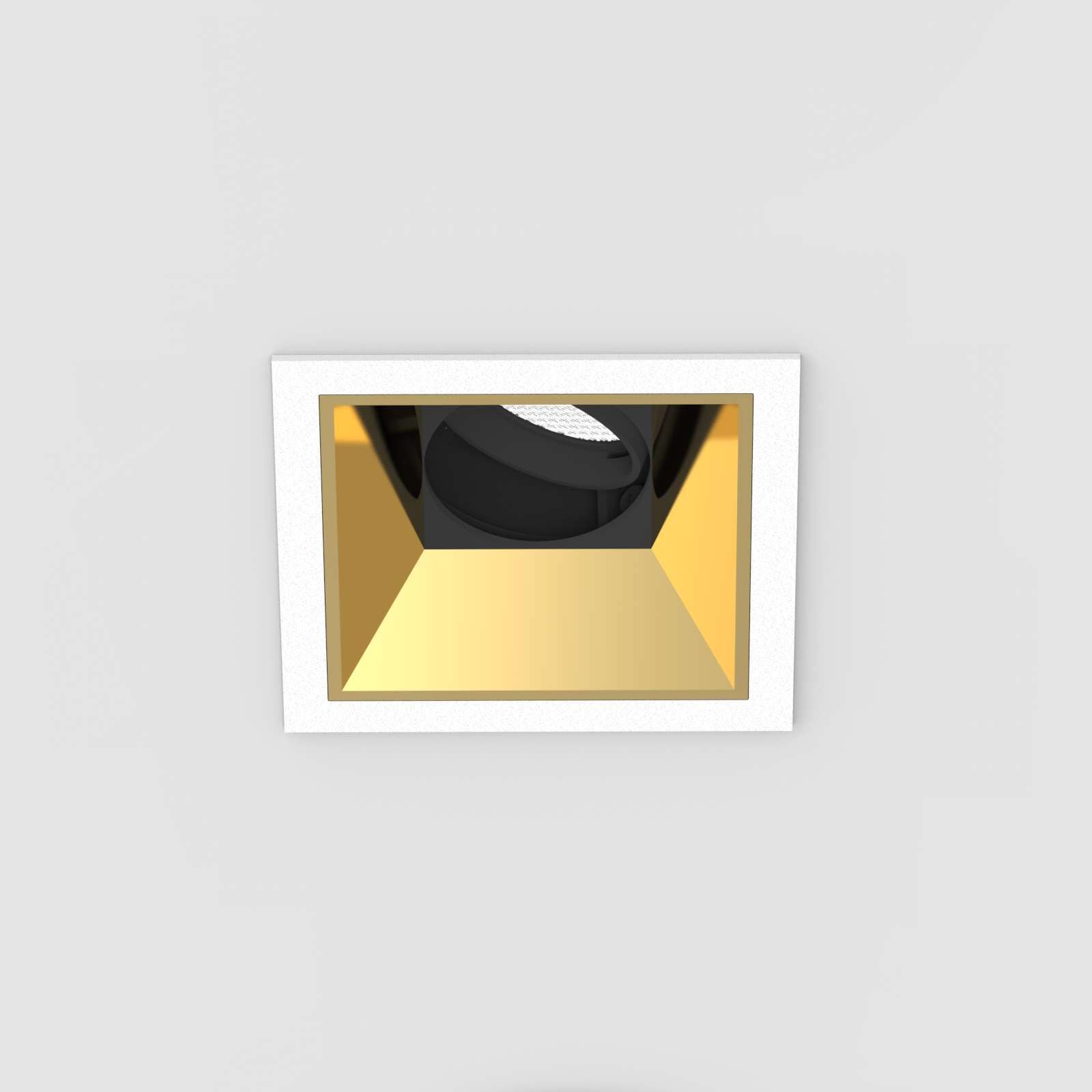 Projecteur carré encastré Led en aluminium moulé sous pression thermolaqué boîtier/cadre blanc mat et Cône anti-éblouissement noir mat, réflecteur secondaire or brillant. La technologie LED de dernière génération avec un flux lumineux de941 lm pour13,5 W Distribution symétrique dans la température de couleur de 4000 K. Caractéristique de rayonnement : un faisceau ’wide flood’ en 50 °. la tête du réflecteur peut être pivotée de 30°, tournée de 355°, Projecteur complet incluant réflecteur et Reflectors and Converter, Indice de rendu des couleurs (IRC) > 90, Evaluation de l'éblouissement selon la classification selon DIN EN 12464-1.2021-11 avec UGR < 19, luminaire de poste de travail compatible écran selon DIN EN 12464-1 (luminosité à 65° <= 1500 cd/m²), Durée de vie nominale > 60.000 h [selon le décret de l’UE]. Indice de protection IP20, classe de protection II. Remplacement du réflecteur secondaire possible sans outils. Peut être commandé en plus avec un capteur externe de mouvement et de lumière du jour. Sur demande également en version d’éclairage d’urgence, batterie 3h. Option de commutateur : A, Dimensions : LxlxH : 78x78x098 mm, Découpe LxlxH : 68x68x148 mm, Poids : 0,3 kg
