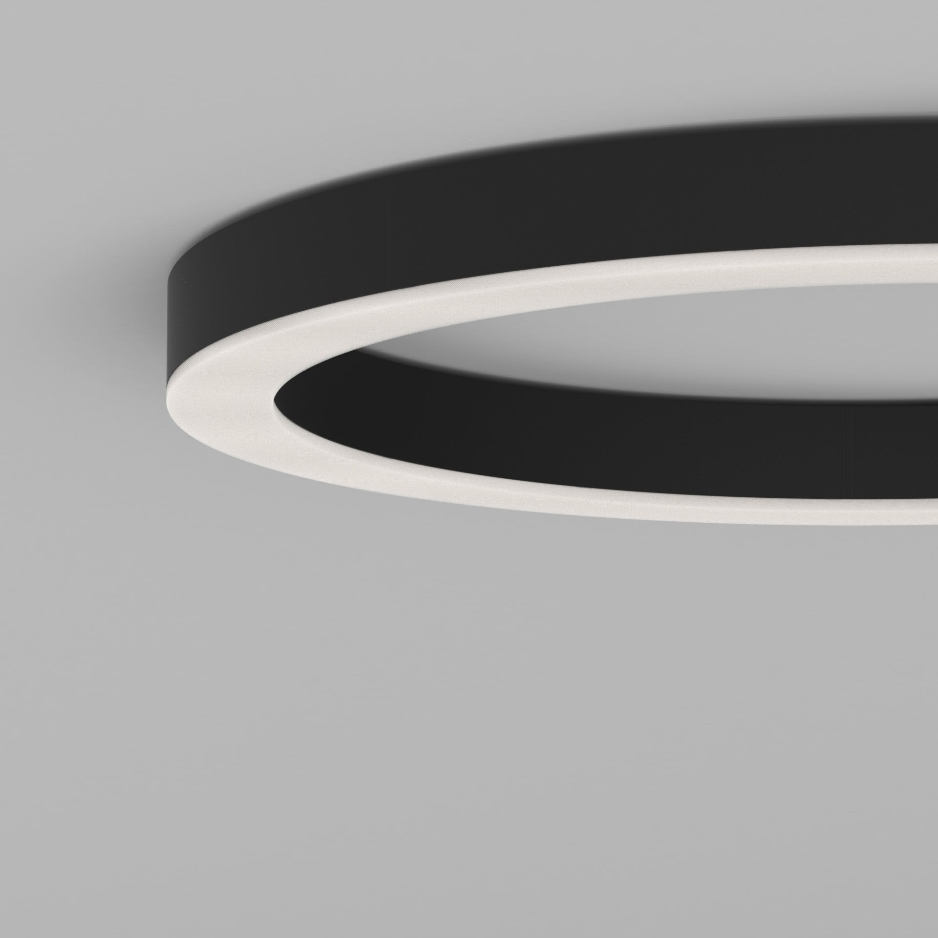 Anneau lumineux LED de grande qualité avec boîtier de luminaire au design minimaliste, en tôle d’acier soudée sans soudure apparente avec surface thermolaquée en noir ’RAL9005’, structure fine mate, pour montage en saillie , pour éclairage direct. Raccordement électrique par 5 pôles utilisés. Diffuseuren PMMA satiné pour un éclairage homogène, de 7 mm de haut pour la diffusion latérale. Luminaire équipé d’une technologie LED innovante avec une efficacité de 55 lm par W et une flux lumineux sortant de Convertisseur DALI pour gradation inclus, Nombre d''adresses DALI : 2, Evaluation de l''éblouissement selon la classification selon DIN EN 12464-1.2021-11 avec UGR < 22, luminaire de poste de travail compatible écran selon DIN EN 12464-1 (luminosité à 65° <= 3000 cd/m²), Indice de rendu des couleurs (IRC) > 90, tolérance chromatique étroite MacAdam 3, Indice de protection IP20, classe de protection I, Groupe de risque RG = 0 selon norme IEC 62471, durée de vie nominale > 60.000 h [selon le décret de l’UE]. option de commutateur : C, Dimensions DMxH : 0760x061 mm, largeur de la section 54 mm. Poids : 10.0 kg